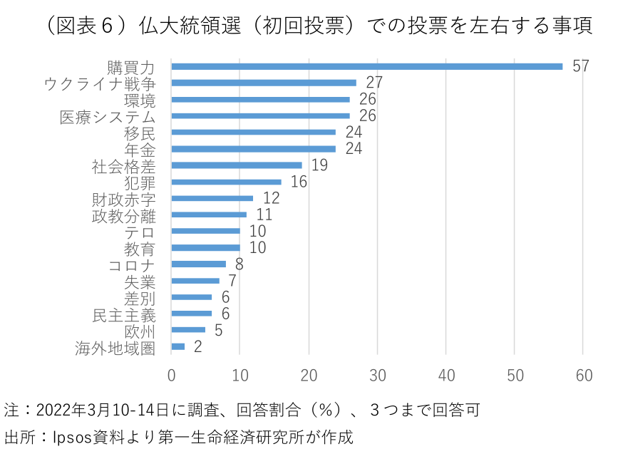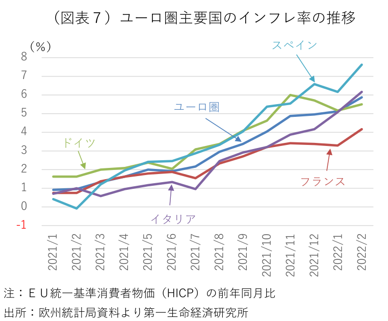 初回投票はこのままマクロン大統領が逃げ切り、ルペン候補が二番手につけ、両候補が24日の決選投票で対峙する可能性が高い。ただ、選挙戦の最終盤でマクロン大統領の支持が頭打ちとなる一方で、ルペン候補とメランション候補が支持を伸ばしている。このことはウクライナ情勢によるマクロン大統領への追い風が一巡するなか、国民の関心が再び物価高騰による家計負担の増加に移っている可能性が示唆される。各種の世論調査では、大統領選の投票を左右する事項として「購買力」が最上位に上がる(図表6)。フランス政府は低所得者向けの給付金支給、ガス料金の凍結や電力料金の値上げ幅抑制で家計負担を軽減しており、フランスの消費者物価の上昇率は他の欧州諸国と比べて限定的となっている(図表7)。だが、国民は他国と比べてどれだけ負担が軽減されているかではなく、数ヶ月前や1年前と比べた負担増を肌で感じている。