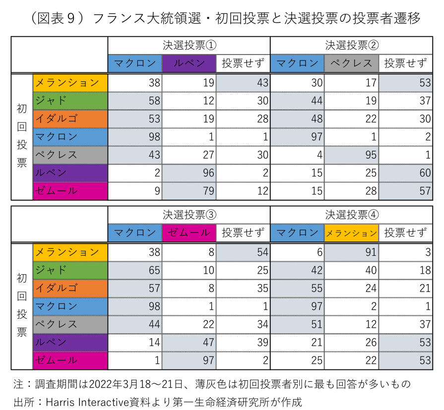 決選投票の世論調査は今のところ、何れの候補と対峙してもマクロン大統領が勝利することを示唆している(図表8)。ルペン候補が決選投票に進出する場合、初回投票でゼムール候補を支持した有権者の多くがルペン支持に回る一方、社会党のイダルゴ候補や環境政党「欧州エコロジー=緑の党」のジャド候補など左派系候補を支持した有権者の多くがマクロン支持に回る可能性が高い(図表9)。ルペン候補がマクロン候補との差を縮めるには、ペクレス候補を支持した有権者をマクロン候補から奪うことや、メランション候補を支持した有権者の棄権票が増えることが必要となりそうだ。