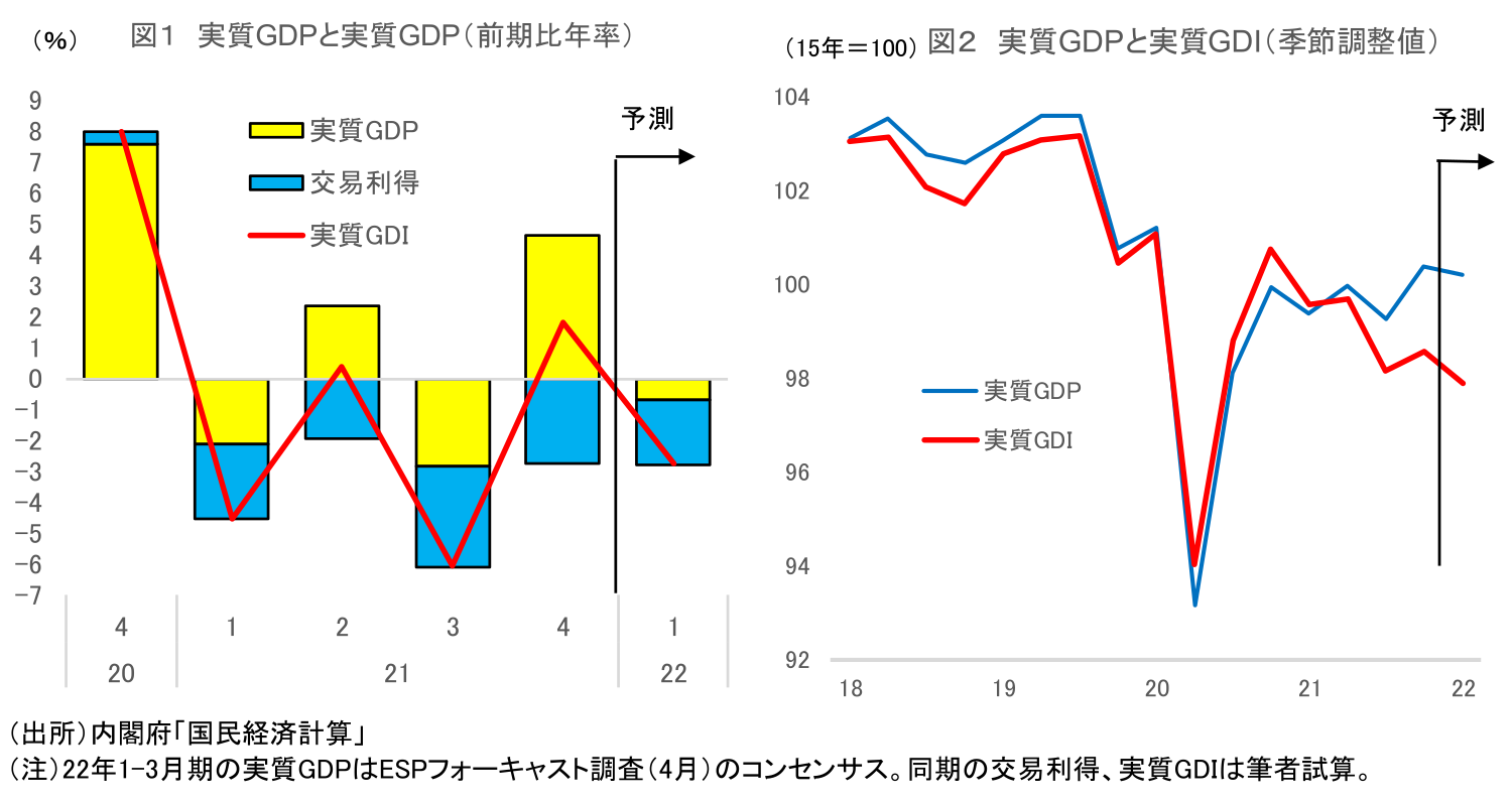 - ロシアのウクライナ侵攻により資源価格が急騰したことの影響が本格化するのは4月以降。4-6月期の輸入物価が1-3月期以上の伸びになることは不可避で、交易損失の拡大ペースもさらに加速する見込み。実質GDPと実質GDIの乖離も一段と拡大するだろう。