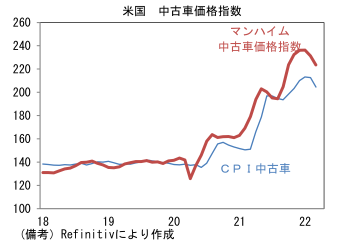 上述のように米国のサプライチェーン問題に起因するインフレ圧力は今後低減していく可能性が高まっている。中国のロックダウン影響は懸念されるが、少なくとも米国内においては労働者数の増加が続くことでサプライチェーンの修復が進むと判断される。また不確実性の高い一次産品価格も3月上旬にみられたパニック的な高騰は一服しており、4月以降は限界的なインフレ圧力が弱まると期待される。
