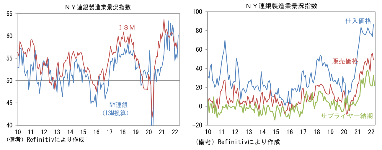 - 4月NY連銀製造業景況指数は+24.6へと3月の▲11.8から大幅に改善。雇用(+14.5→+7.3)は低下したものの、生産(▲7.4→+34.5)と新規受注(▲11.2→+25.1)が大幅に改善しヘッドラインはプラス圏を回復。注目のサプライヤー納期(+32.7→+21.8)は大幅に短縮し、販売価格(+56.1→+49.1)も低下。仕入価格は再び上昇したが、総じてみればサプライチェーン問題は終息に向かっていると判断される。その他では在庫(+21.5→+13.6)が減少、週平均労働時間(+3.5→+10.0)と受注残(+13.1→+17.3)が上昇。6ヶ月先の期待項目は業況(+36.6→+15.2)が大幅に低下した反面、雇用(+27.0→+25.8)と設備投資(+35.5→+31.8)が低下した。