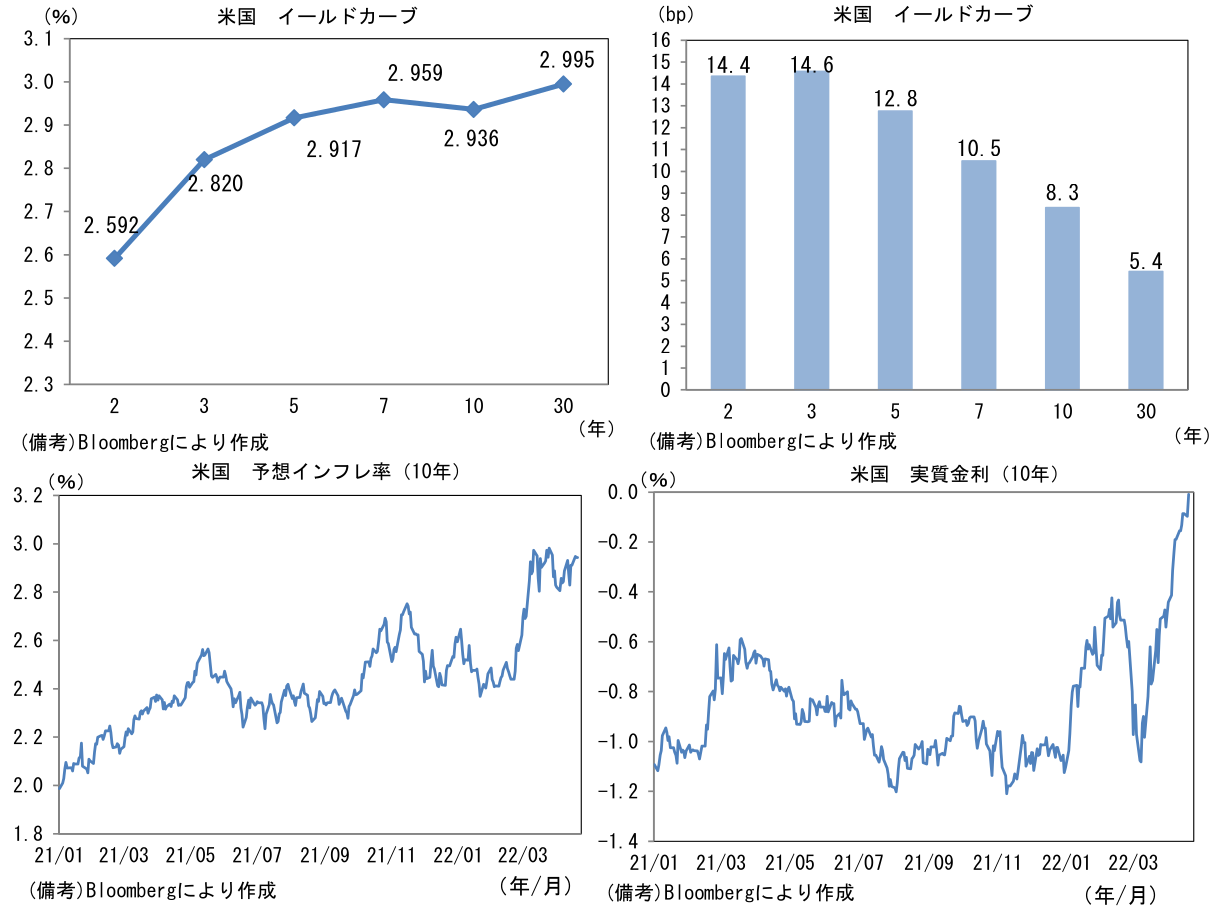 - 米金利カーブはベア・フラット化。債券市場の予想インフレ率(10年BEI)は2.943%(▲0.5bp)へと低下。実質金利は▲0.009%(+8.8bp)へと上昇し、その後の日本時間でプラス圏に到達。