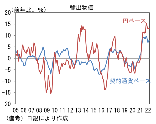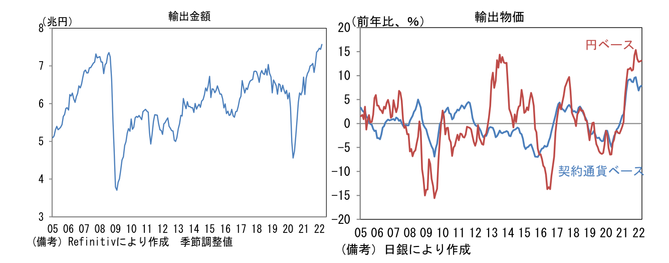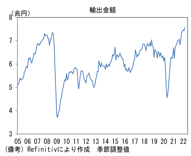 - 日本の3月貿易統計によると輸出金額は8兆4,609億円となり、3月としては過去最高を更新。前年比では+14.7%であった。増加の要因は数量が▲1.5%と減少したものの、価格(≒平均単価)が+16.0%と大幅に伸びたことで輸出金額が嵩上げされた形。通関時に適用されたUSD/JPYの平均レートは115.86と前年から8.1%の円安水準であったから、この間の円安が大きく貢献したことがわかる。季節調整値の輸出金額は前月比+1.7%、7兆5,702億円と過去最高を更新。「リーマンショック後の円高で日本企業は海外に生産拠点を移転したからもう輸出は増えない」といった認識が定着していたが、それが覆された格好だ。サプライチェーン問題によって自動車輸出が停滞した反面、半導体製造装置(前年比+45.8%)や鉄鋼(+38.8%)などが大幅に増加した。「稼ぎ頭」の米国向け自動車輸出は前年比▲16.7%であった。なお、日銀が算出する3月の輸出物価によれば、円建ては前年比+13.1%、契約通貨建ては+7.9%であった。