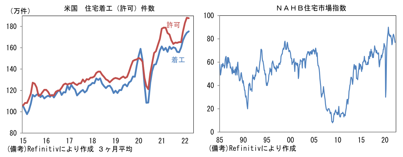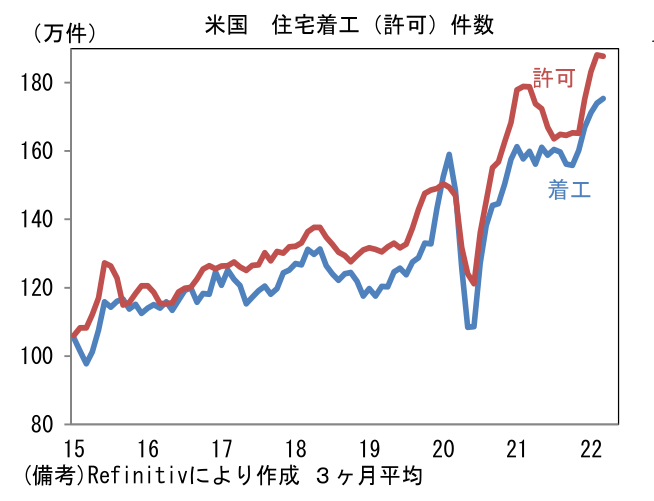 - 3月米住宅着工件数は前月比+0.3%、179.3万件と市場予想(174.0万件)を上回った。増加は2ヶ月連続。建設コストの高止まり、住宅ローン金利の上昇にもかかわらず、パンデミック発生後で最も高い水準に到達した。先行指標の許可件数も強く、住宅購入意欲がなお旺盛であることを示している。もっとも住宅建設業者の景況感は頭打ち感がみられており、先行きは住宅市場の鈍化も懸念される。