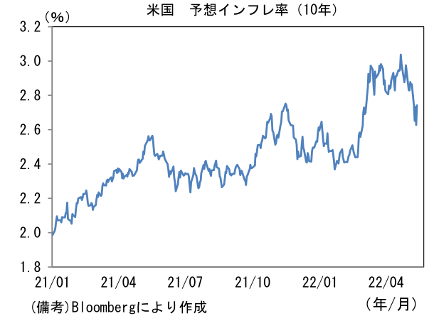 - 金属価格下落の主背景は、中国の厳格なロックダウンに伴う経済活動の冷え込みと考えるのが自然だろう。4月の社会融資総量(新規調達額)は経済活動の落ち込みを映じて急減し、残高の伸びも+10.2%へと小幅ながら縮小。既発表のPMIや貿易統計の落ち込みと整合的であった。こうした短期かつ一時的要因と考えられる事象に加えて、米国の消費者マインド悪化に歯止めがかかっておらず、米GDPの約7割を占める個人消費の減速懸念が強まっていることも重要だろう。その点、5月ミシガン大学消費者信頼感指数(速報値)は失望的な結果であった。マインド悪化の根源であるインフレに関しては1年先が5.4%、5年先5年が3.0%と高止まりし、そうした下で現況指数は63.6へと大幅に悪化。先行き指数も56.3に沈み、ヘッドラインは59.1へと低下し、リーマンショック時のボトムに接近した。インフレが雇用環境の回復を帳消しにしている様子が見て取れ、消費者は「諦め」の姿勢を示しているように感じられる。類似指標のNY連銀調査でも予想インフレ率の高止まりが示されていた。予想インフレ率は1年先が6.3%へと0.3%pt低下したものの、3年先は3.9%へと0.3%pt上昇。3年先はピーク時の水準をなお下回っているとはいえ、消費者がインフレは「一時的」ではない現象であると判断する傾向が強まっている可能性を示唆する。今後、サプライチェーン問題の終息に伴いインフレ圧力が緩和することで消費者マインド改善が期待されるが、一方でFedの引締め効果発現することで労働市場の回復ペースが鈍化し、そのまま景気が冷え込む可能性もある。米長期金利の低下にはそうした不安が内包されているだろう。