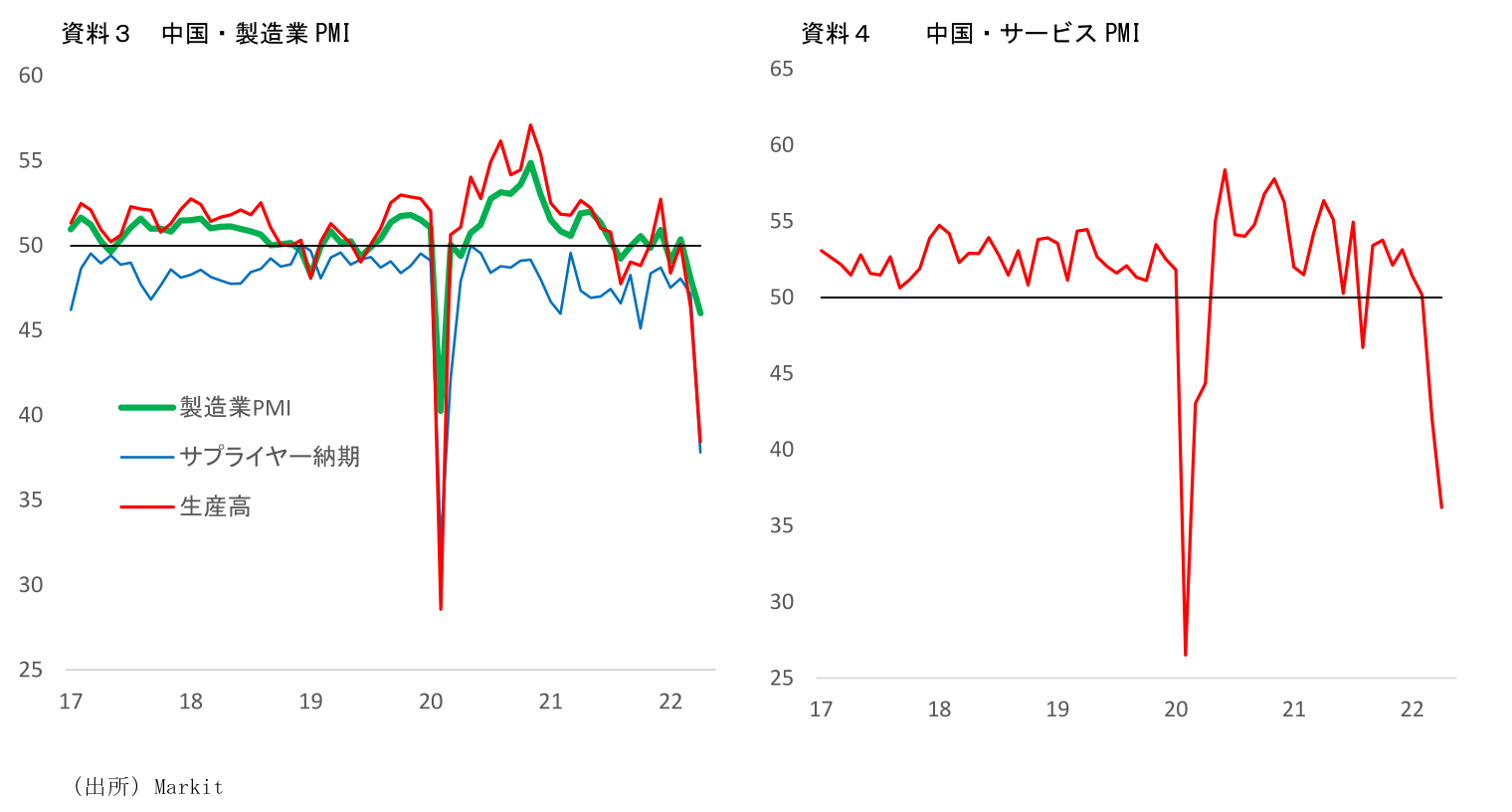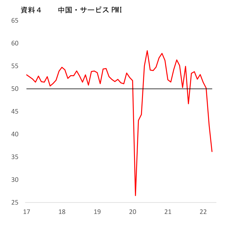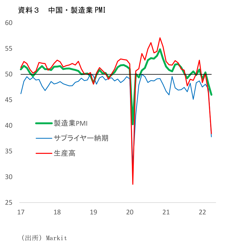 目先の4-6月期について特に懸念されるのが中国経済の動向だ。中国では上海市などでロックダウンが実施され、中国国内での経済活動に幅広く悪影響が生じていることに加え、サプライチェーンの混乱から世界的にも悪影響が広がっている。足元では企業の景況感が大幅に悪化しているほか、工業生産や小売売上高も大きく落ち込んだ。