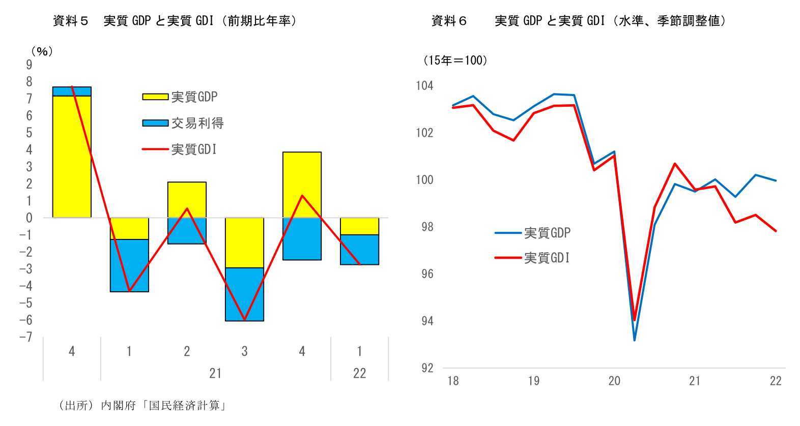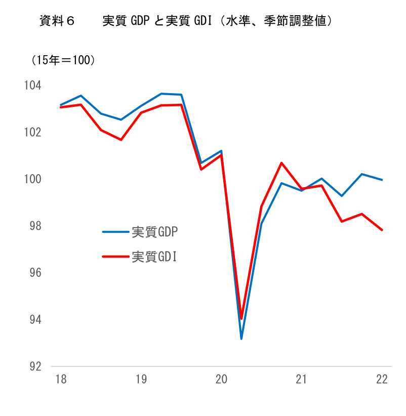 実質GDPと実質GDIの推移を比較すると、21年1-3月期以降、実質GDPはプラスとマイナスを繰り返しながら概ね横ばい圏内の動きを続けていたのに対して、実質GDIは水準を切り下げており、両者に大きな乖離が生じている。実質GDPは国内の生産活動を把握するのに適しているが、交易条件の変化によって生じる購買力の変化を把握することはできない。家計の生活実感や企業の景況感を見る上では実質GDIの方が適しているともいえ、足元の実質GDIの悪化は非常に懸念されるところだ。