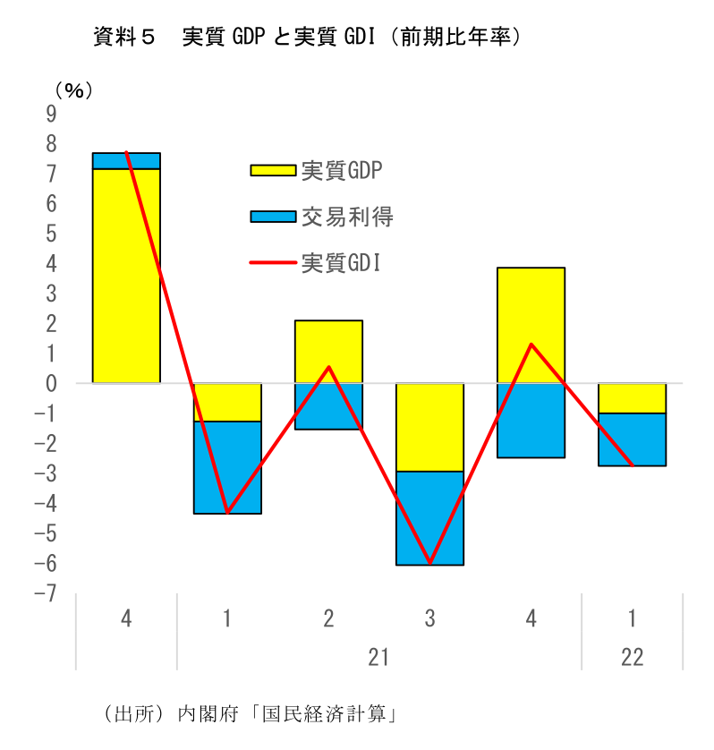 GDP統計では、交易条件の変化が与える効果の大きさを「交易利得」として計上しており、実質GDPに交易利得(損失)を加えたものを実質GDI(国内総所得)と言う。この交易損失は輸入物価の上昇を背景としてここ数四半期大幅に悪化しており、1-3月期は一段と拡大した。こうした海外への所得流出を反映し、1-3月期の実質GDIは前期比年率▲2.7%と大幅マイナスとなっている。