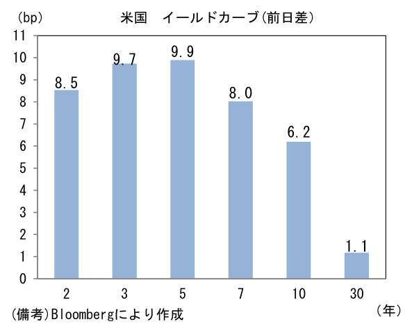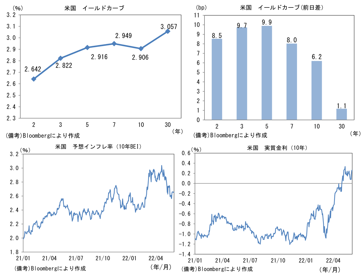 - 米金利はベア・フラット化傾向。債券市場の予想インフレ率(10年BEI)は2.656%(+0.3bp)へと上昇し、実質金利は0.253%(+6.1bp)へと上昇した。