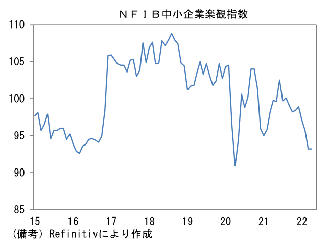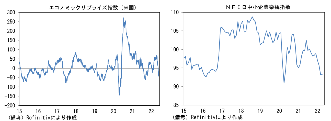- 過去数週間、米経済指標が相次いで市場予想を下振れたことで米国のエコノミックサプライズ指数は明確なマイナス圏に落ち込んでいた。「予想比下振れ」が頻発するなかで「予想外の上昇」は想像しにくかったこともあり、今回の結果はポジティブサプライズ感があった。もっとも、ISMは単月で改善したとはいえ、企業の先行き見通しが慎重化していること等から判断すると、下降トレンドが反転したとは考えにくく、何とも中途半端な結果であった。先行きの企業マインド慎重化を示すものとしてはNY連銀やフィラデルフィア連銀の製造業調査があり、6ヶ月先の業況や雇用、設備投資を問う項目が何れも下向き基調にある。その他ではNFIB中小企業調査においても下向きの企業マインドが示されている。
