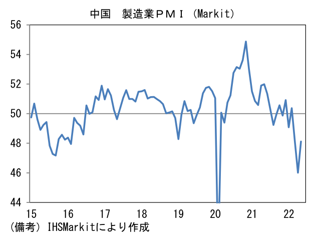 - 5月中国製造業(IHS Markit)は48.1へと2.1pt上昇。上海における厳格なロックダウン影響で参考値程度の扱いに過ぎないが、4月対比で経済活動が正常化に向かっていたことが示された。6月は挽回生産によって節目の50回復が期待される。