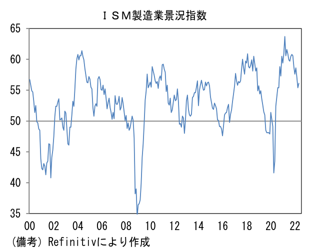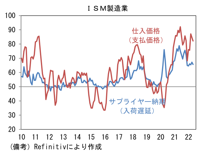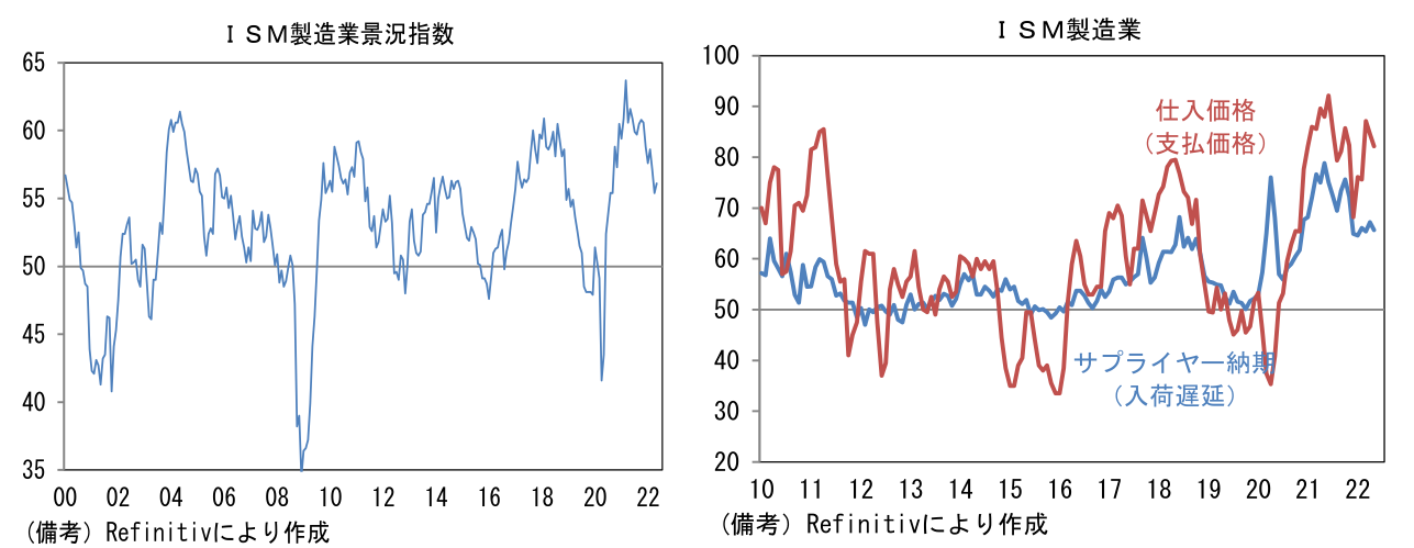 - 5月ISM製造業景況指数は56.1へと予想外に改善。4月の55.4から0.7pt上昇し、市場予想の54.5を上回った。内訳は生産(53.6→54.2)と新規受注(53.5→55.1)が共に改善した反面、雇用(50.9→49.6)は50を割れた。注目のサプライヤー納期(67.2→65.7)は短縮化しヘッドライン下押しに寄与。反対に在庫(51.6→55.9)は押し上げに寄与した。サプライチェーンが快方に向かう下で、生産と受注が伸びる理想的な姿が示され、仕入価格も82.2へと2.4pt低下した。高水準に積み上がる受注残(56.0→58.7)や低水準で推移する顧客在庫(37.1→32.7)は、サプライヤーチェーン問題がなお深刻でインフレ圧力が強いことを物語っているが、製造業PMIや地区連銀サーベイにおいてもサプライヤー納期短縮化の傾向が認められていることを踏まえれば、全体として供給制約は和らいでいると判断される。なお、サプライヤー納期を除いて算出したヘッドラインは4月が52.4、5月は53.7であった。