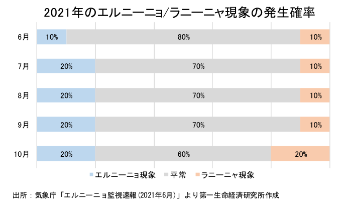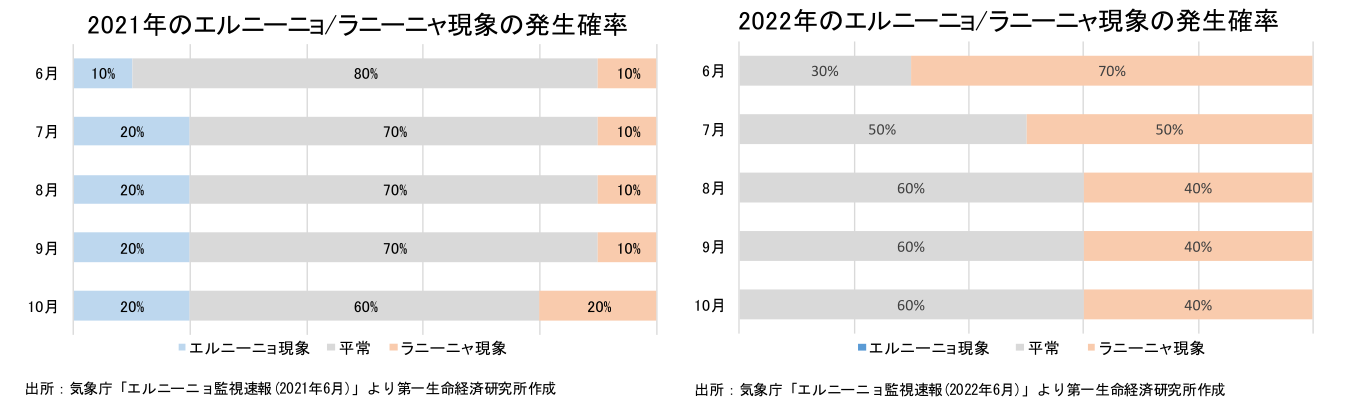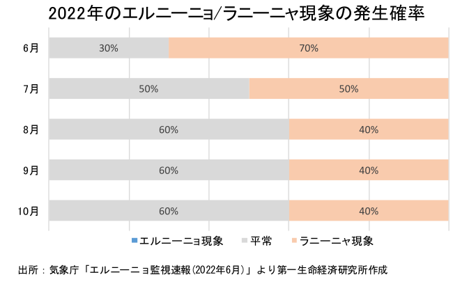 電気代が高騰する中で、更に追い打ちをかけるのが猛暑である。今年の夏はラニーニャ現象1によって暑い夏となることが予想されている。昨年6月に予想された夏におけるラニーニャ現象の発生確率は10%と低く、実際、昨年の夏にラニーニャ現象は発生しなかったが、2022年についてはラニーニャ現象の発生確率は昨年と比較して高く予想されている。今年の夏にラニーニャ現象が発生し、猛暑となれば、家庭でのエアコンや扇風機等の使用時間が長くなり、消費電力量も増加することが想定される。エネルギー価格の上昇によって電気料金の単価が高騰する中、電力消費量の増加を余儀なくされることで、家計の電気代負担額は更に増額する可能性がある。