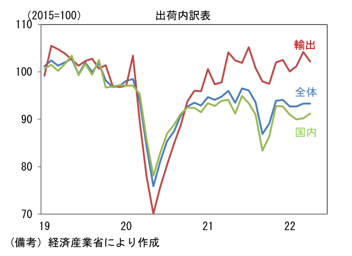 日本の6月PMIは後述する欧米対比で良好な結果であった。製造業PMIは52.7へと0.6pt低下したものの、2001年の統計開始以来の平均値50.7を上回っている。内訳は生産(51.5→51.0)と新規受注(50.4→49.4)が低下した反面、雇用(51.9→52.0)は高水準維持。中間財投入を示す購買品在庫(54.5→53.7)はヘッドライン下押しに寄与し、注目のサプライヤー納期(62.9→62.3)は短縮化し、ヘッドラインを下押しした(サプライヤー納期は公表値を筆者が符号調整、調整後の指数低下は納期短縮化を意味しヘッドラインを下押しする)。その他では新規輸出受注(46.2→47.3)が増加方向に転じ、販売価格(61.4→62.7)は上昇基調を強めた。半導体不足によって自動車生産の回復が遅々とするなか、非自動車・家電向けのIT関連財(半導体製造装置、部材、電子部品)の増産傾向が一服した可能性が示唆される。反対に6月は内需拡大により国内向けが回復基調を強めたとみられる。経産省公表の出荷内訳表によると4月までの傾向として、国内向け出荷が息を吹き返しつつあった。後述のサービス業PMIの強さなどから判断して、この傾向は6月現在も続いているとみられる。