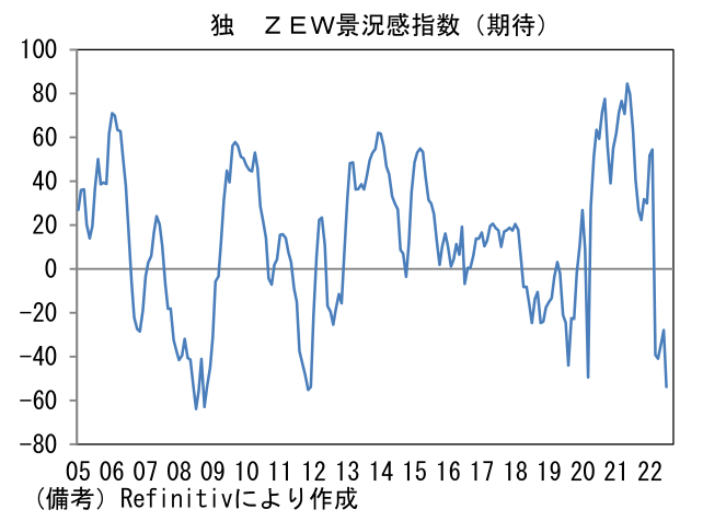 - 7月ZEW企業景況感指数はヘッドラインである期待指数が▲53.8へと落ち込み、リーマンショックや欧州債務危機に匹敵する低水準を記録。パンデミックからのペントアップ需要が一巡する中、冬場に備えてエネルギー戦略の急転換を求められており景気見通しは急速に悪化している。