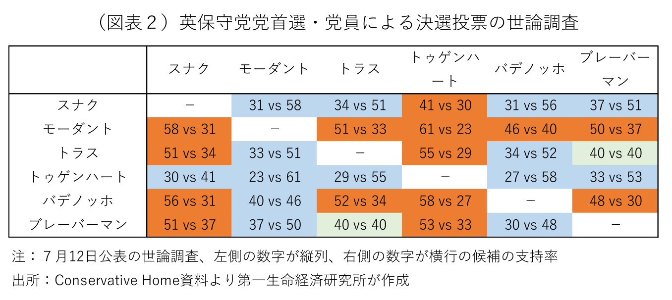 初回投票前の12日に発表された保守党員を対象にした決選投票の世論調査では、党内右派のトラス・バデノッホ・ブレーバーマン候補と対峙した場合、中道派の決選投票進出者がスナク候補やトゥゲンハート候補の場合には何れも右派候補に敗北し、モーダント候補の場合には何れも勝利する(図表2)。こうした世論調査の結果は、今後の党首選や議員投票後の投票キャンペーンで変わりうるが、初回投票でリードしたスナク候補が首相就任に近づいたとは必ずしも言えない。