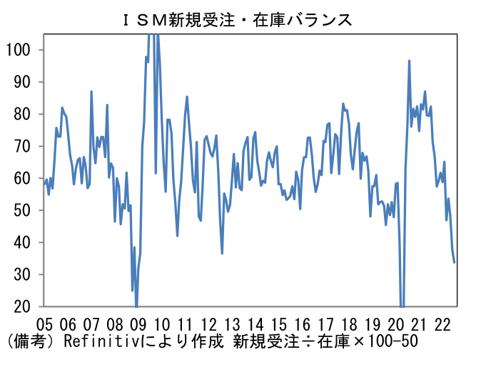 - 生産活動の先行きを読む上で有用な新規受注・在庫バランスは一段と悪化し、リーマンショックとコロナパンデミック発生初期を除くとほとんど経験したことのないレベルへと低下した。新規受注が低下するなか、在庫はリーマンショック時のピーク水準すら上回った。在庫は「意図的」なものと「意図しない」ものが混在しているとみられ、必ずしも不良在庫とは限らないが、いずれにせよ先行きの生産を抑制する公算が大きい。