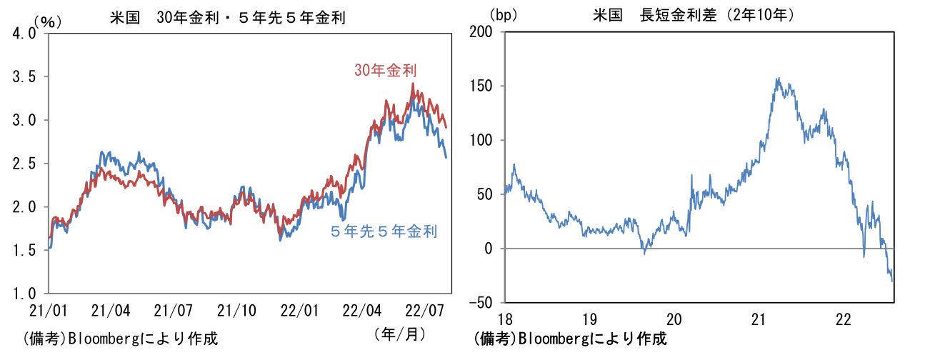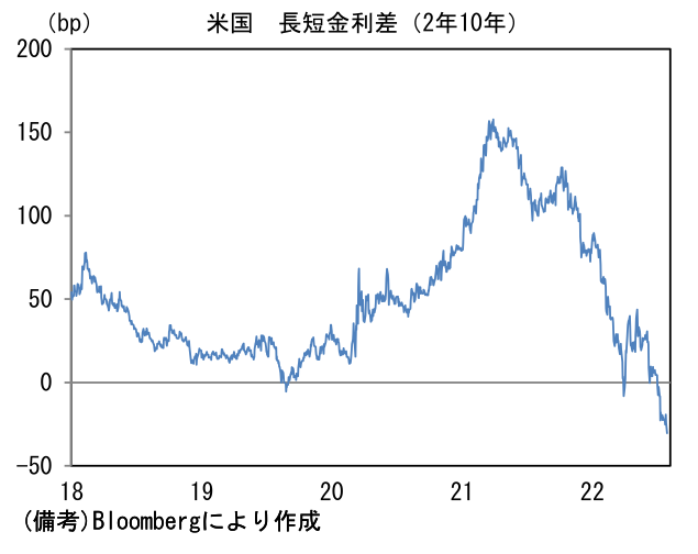 - そうした米国経済の減速懸念を反映し米長期金利は低下傾向を強め、10年金利は2.5%台に突入し、30年金利ははっきりと3%を割れた。また中長期的な経済・物価見通しを反映する傾向にある5年先5年金利も2.57%へと低下し、Fedが推計する中立金利に近づいた。こうした(超)長期金利の低下によってイールドカーブはフラット化傾向を強め、長短金利差は一段と逆転が進行。メジャーな尺度である2年10年金利差は▲30bpまで拡大し、2019年の水準を明確に下回った。ISM製造業景況指数が節目の50に接近するなど景気減速の兆候が増加している現状、年末の政策金利(誘導目標上限値)が3.5%に達するとの見通しを前提にすると、景気のオーバーキルを意識せざるを得ない状況にあるのだろう。現在のところFedは9月に50bpの利上げを実施した後、年内2回のFOMCで25bpの利上げを実施するとの見方がコンセンサスに近いと思われる。