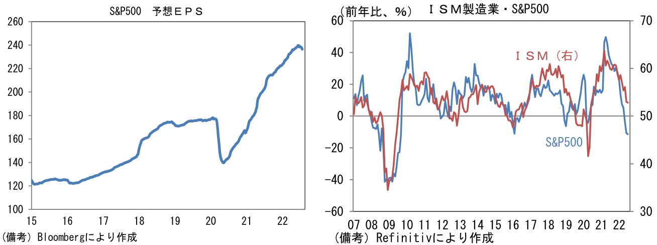 - そうした中、米国株はサマーラリーとも言うべき上昇を遂げている。直近1ヶ月でS&P500は7.7%、ナスダックは11.2%の反発を達成。債券市場と株式市場の空気が相違することはよくある現象だが、株式市場の楽観は業績不安を軽視しているとの印象を禁じ得ない。最近の金利低下が株式(特にグロース株)の相対的魅力を高めていることは事実だが、肝心の予想EPS(12ヶ月先)に目を向けると、直近は下向き基調に転じており業績不安を惹起する形状になっている。今後、米長期金利がFedの利下げを本格的に織り込み一段と低下傾向を強め、その間に業績不安が払拭されるならば現在の株高は正当化されそうだが、それはいかにもナローパスであろう。株価の本格的上昇にはISM製造業の反転上昇など、業績不安を和らげるマクロ指標の改善を待ちたい。