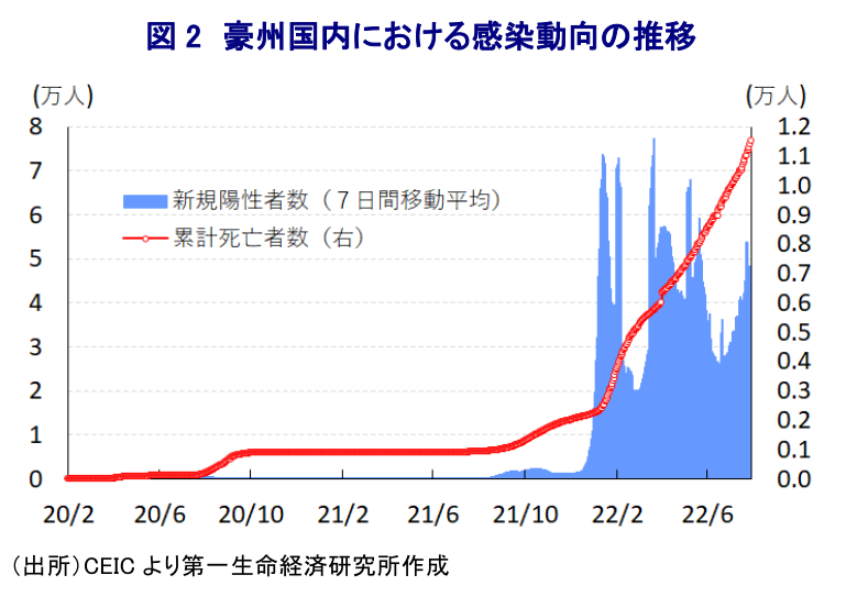 豪州では年明け以降、感染力の強い変異株により新型コロナウイルスの感染が再拡大したものの、政府はワクチン接種の進展を理由に経済活動の正常化を進める『ウィズ・コロナ』戦略を維持する対応をみせてきた。これは今年5月に総選挙(連邦議会下院総選挙)が実施されるなど『政治の季節』が近付いており、コロナ禍からの逸早い景気回復が優先されたことも影響したと考えられる。しかし、ここ数年の自然災害の頻発やコロナ禍への対応に加え、このところの物価高など政権への逆風が吹き荒れるなか、総選挙では9年ぶりの政権交代が行われることとなった(注1)。他方、感染再拡大を受けて国民の間に感染予防に向けた行動規制の動きが広がり、人の移動に下押し圧力が掛かるなど景気への悪影響が懸念されたものの、その後の人の移動は底堅い推移が続くとともに、企業マインドも製造業、サービス業ともに堅調な推移が続いている。さらに、ウィズ・コロナ戦略の維持も追い風に6月の失業率は48年ぶりの低水準となるなど雇用の回復が進んでおり(注2)、物価高にも拘らず家計消費は堅調に推移したことで物価は一段と上振れしてインフレ率は21年ぶりの水準となっている(注3)。このように景気に対して好悪双方の材料が混在する状況が続く一方、同国内の新規陽性者は3月初旬を境に頭打ちする動きがみられたものの、その後も高止まりが続いてきたほか、足下では再び底入れするなど感染動向は再び厳しさを増している。事実、足下の人口100万人当たりの新規陽性者数(7日間移動平均)は2,000人前後で推移するなど感染爆発が懸念される状況が続いているほか、医療機関への圧力が急速に強まるなかで死亡者数の拡大ペースも加速するなど感染動向は急速に悪化している。こうした状況ではあるものの、政府は国民に対してワクチンの追加接種の加速化に加え、混雑時や屋内でのマスク着用、体調が悪い場合の自宅滞在を呼び掛ける一方、行動制限には抑制的な姿勢をみせるなどウィズ・コロナ戦略を維持している。感染動向の急激な悪化が景気に与える影響は不透明ではあるものの、政府は引き続き景気回復を優先する姿勢を崩していないと捉えられる。