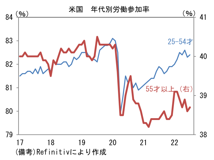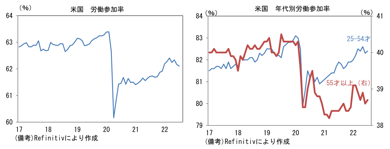- 7月雇用統計で失望的だった点は労働参加率の低下。昨年来、緩慢ながらも回復基調にあった労働参加率は2ヶ月連続で低下し62.10%となった。労働参加率は、いわゆる働き盛り世代とされる25-54歳が82.4%、55歳以上が38.7%へと双方とも僅かに改善したものの、共にパンデミック直前は下回っている。特に深刻なのは55歳以上の世代。パンデミック発生初期にレイオフや解雇の対象となった後、失業給付と株式・不動産など資産価格上昇に支えられ、そのままアーリー・リタイアを決めた人々は依然として労働市場の外にいる。高インフレと資産価格下落に直面し、復職すると考えられるが、そのペースは非常に緩慢で人手不足の原因、換言すればインフレの根源となっている。
