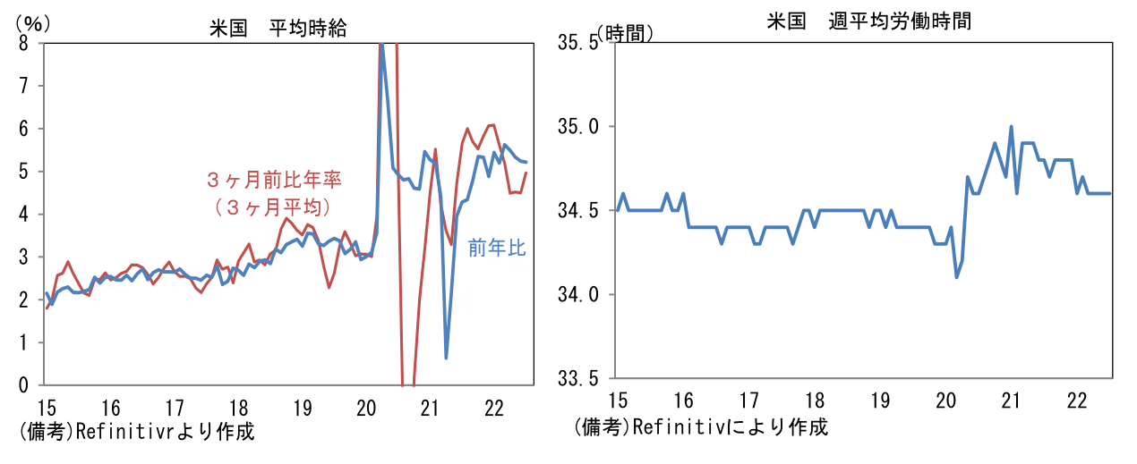 - そうした労働市場の歪みを背景に平均時給は+0.5%、前年比+5.2%と市場予想を上回る伸びとなり、6月まで減速基調にあった3ヶ月前比年率は+5.3%、同3ヶ月平均で+5.0%と再加速“してしまった”。一般的に賃金上昇はマクロ経済的に好ましい事象であるが、ここまで極端な上昇はそれ自体が高インフレを作り出しそれを増幅してしまうことから、寧ろ好ましくない結果をもたらす。またこれまで落ち着く傾向にあった週平均労働時間は過去分の上方修正によって34.6時間で横ばいとなった。6月までは週平均労働時間が短縮化傾向にある下で平均時給が減速基調にあり、賃金インフレの鈍化を示す構図となっていたが、7月の結果は賃金インフレのしつこさを再確認させる結果となった。