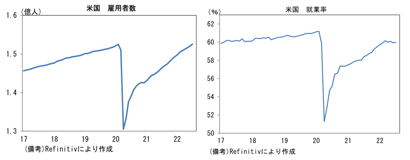 雇用者数は前月比+52.8万人と市場予想(+23.0万人)を大幅に上回る増加となり、過去2ヶ月分も2.8万人分が上方修正された。教育(+12.2万人)、レジャー・ホスピタリティ(+9.6万人)、専門職(+8.9万人)、建設(+3.2万人)など広範な業種で増加し、雇用者数の水準はパンデミック発生前を回復した。もっとも、後述する労働参加率の低下を背景に就業率(16歳以上人口に占める就業者の割合)は59.96%とパンデミックで生じた断層が埋まっておらず、労働市場の「厚み」が失われたままであることを浮き彫りにしている。