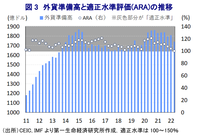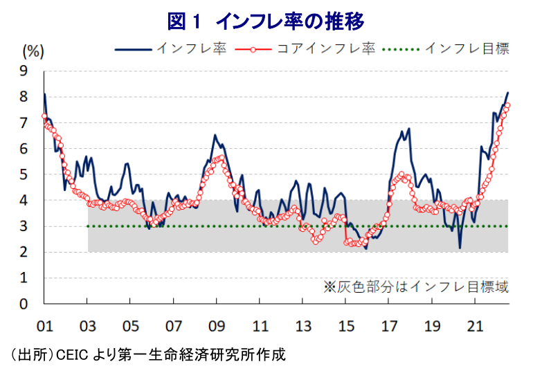 コロナ禍からの世界経済の回復による需要拡大期待に加え、ウクライナ問題の激化による供給不安も重なり、幅広く商品市況が上振れしたことによる世界的なインフレ圧力の高まりを受け、米FRB(連邦準備制度理事会)をはじめとする主要国中銀はインフレ抑制を目的にタカ派傾斜を強めてきた。こうした動きを受けて、コロナ禍対応を目的とする全世界的な金融緩和を追い風とする『カネ余り』の手仕舞いが進むなど、国際金融市場においては世界的なマネーフローに影響を与えるなど、経済のファンダメンタルズ(基礎的条件)が脆弱な新興国に資金流出が集中することが懸念される。なお、メキシコは米国と陸続きという地理的特徴も影響して輸出の約8割を米国向けが占めるほか、GDPの約4%を占める移民送金の大宗を米国からの流入が占めるなど米国経済への依存度が極めて高い。他方、同国では2018年末に誕生した左派のロペス=オブラドール政権による『反ビジネス』色の強い政策運営が足かせとなる形で対内直接投資が細り、今年1-3月時点においても実質GDPの水準はコロナ禍前を下回るなど他の新興国と比較して回復が遅れている。さらに、産油国である同国経済にとって昨年来の原油相場の底入れの動きは景気の追い風になることが期待されたものの、ここ数年は産油量が先細りするなかで総輸出に占める原油の割合は1割にも満たず、経常収支は赤字基調で推移するなど経済のファンダメンタルズは脆弱さを抱える。また、このところの幅広い商品高によるインフレの動きは同国にも影響を与えており、足下のインフレ率は中銀の定めるインフレ目標を大きく上回るとともに、依然として加速が続くなど収束の見通しが立たない状況が続いている。なお、中銀はインフレ抑制を理由に昨年6月に2年半ぶりの利上げ実施を決定する金融引き締めに動いたものの、その後もインフレは一段と上振れしたことに加え、米FRBのタカ派傾斜に伴う資金流出懸念に対応して断続的に利上げに動くとともに、利上げ幅を拡大させるなどタカ派姿勢を強めてきた(注1)。この背景には、1990年代の米FRBの利上げ局面に際して同国が金融危機に陥ったことが挙げられる一方、当時は通貨ペソ相場の米ドルとのペッグ(固定)が金融危機の一因になったものの、その後の変動相場制への移行などに伴いそうしたリスクは大きく後退している。他方、資金流出による通貨安は輸入物価を通じたインフレ昂進を招くほか、近年は米ドルなど主要通貨での資金調達が活発化するなかで債務負担の増大が幅広い経済活動の足かせとなる可能性があるため、過度な資金流出を抑制する観点から米FRBと歩調を合わせる必要に迫られている。米FRBが先月末のFOMC(連邦公開市場委員会)において2会合連続で75bpの大幅利上げを実施したことを受けて、中銀は11日の定例会合において10会合連続の利上げ実施を決定するとともに、6月の前回会合同様に利上げ幅を75bpとするなど米FRBと歩調を合わせる決定を行った。これを受けて政策金利は8.50%と過去最高の水準となるとともに、実質金利もプラスに転じるなど先行きは引き締めの影響が一段と強まることが予想される。会合後に公表された声明文では、先行きの政策運営について「実勢に基づく形で次回の政策決定に向けて引き上げ幅を評価する」とするなど、6月の前回会合では大幅利上げに含みを持たせる強い表現が示されていた状況からタカ派姿勢が後退したと捉えられる。他方、物価を巡るリスクについては引き続き「予測期間内のインフレ動向に対するバランスは依然としてかなり上向きに偏っている」とするなど一段の上振れを警戒する動きをみせている。よって、先行きも米FRBの歩調に合わせる形で一段の引き締めを迫られると見込まれ、基本的には米FRBとの間で600bpの金利差を維持する対応が続くと予想される。なお、足下のペソ相場を巡っては米FRBの政策運営に対する見方のほか、原油をはじめとする商品市況が影響する形で一進一退の動きをみせている一方、足下では外貨準備の減少が確認されており、IMF(国際通貨基金)による国際金融市場の動揺への耐性を示す適正水準評価(ARA)は辛うじて『適正水準』を確保出来ているものの、今後の市場環境によっては体力が蝕まれる事態も予想される。その意味では、先行きは同国の景気動向如何に拘らず一段の金融引き締めを迫られることも考えられるなど、政策対応は厳しさを増す展開が見込まれる。