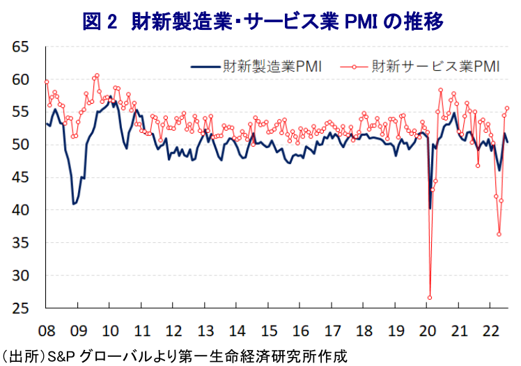 年明け以降の中国経済を巡っては、感染力の強い変異株による新型コロナウイルスの感染再拡大に直面するとともに、当局は『ゼロ・コロナ』戦略に拘泥する対応をみせたことで、大規模な検査のほか、事実上の都市封鎖(ロックダウン)が実施されるなど、幅広い経済活動に悪影響が出る事態に発展した。さらに、世界最大の貨物取扱量を誇る上海港を擁する上海市のほか、一時は全土でGDPの7割近くを占める地域で一部ないし全体的な都市封鎖が実施された結果、サプライチェーンが大きく混乱するとともに、中国国内のみならずその影響が世界にも広がる事態となった。他方、強力な対策が奏功する形で新規陽性者数は頭打ちするなど感染動向が改善に転じたこともあり、5月中旬以降は都市封鎖の解除の動きが広がり、6月には上海市の都市封鎖も解除されたことで、一旦は混乱が収束する動きがみられた。事実、都市封鎖やサプライチェーンの混乱に伴い大きく下振れした企業マインドは幅広く改善する動きが確認されるなど(注1)、中国景気を取り巻く状況は最悪期を過ぎつつある様子がうかがわれた。しかし、その後も当局によるゼロ・コロナ戦略への拘泥を受けて感染確認の度に大規模な検査が実施されて感染者が隔離されるとともに、局所的に都市封鎖措置が再開される動きも広がり、企業マインドは再び頭打ちするなど景気の不透明感が高まる動きがみられる(注2)。さらに、行動制限の緩和を受けて人の移動が活発化したことで、足下では再び新規陽性者数が拡大する動きが確認されており、観光地などで移動制限や局所的な都市封鎖が再開される動きがみられる。なお、足下の中国経済にとり観光関連産業はGDPの約1割を占めており、コロナ禍前及び一旦収束した後はその拡大が景気拡大の一助となる動きがみられたものの、足下の状況は夏の行楽シーズンと重なるなど景気底入れに向けた期待を挫くことが懸念される。よって、直近の企業マインドを巡っては、製造業でマインドが下振れしている一方、サービス業については堅調さが確認されるなど対照的な動きがみられたものの、足下においてはサービス業のマインドに再び下押し圧力が掛かることが懸念される。その意味では、中国経済は当面の最悪期を過ぎたと捉えられるものの、回復の推進力に乏しい状況にあると捉えることが出来る。