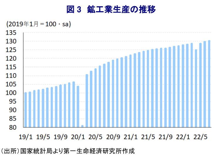 7月の経済指標を巡っては、輸出額は前年同月比+18.0%と一見すると堅調さがうかがえるものの、当研究所が試算した季節調整値に基づく前月比は減少に転じるなど一進一退の動きが続いており、世界経済の回復を主導した欧米など主要国で景気減速懸念が高まっていることが外需の重石になっているとみられる(注3)。こうした動きを反映して7月の鉱工業生産(実質ベース)は前年同月比+3.8%と前月(同+3.9%)からわずかに伸びが鈍化しており、行動制限の解除などを反映して底入れの動きを強めてきた流れに一服感が出ている。前月比は+0.38%と前月(同+0.84%)に続いて3ヶ月連続で拡大しており、水準そのものも上海市をはじめとする都市封鎖の実施を受けて大きく下振れする直前の今年2月を上回るなど、その影響を克服していると捉えられる。ただし、拡大ペースは昨年後半並の水準に留まる展開が続いており、生産活動が景気回復のけん引役となる状況とはなっていない。夏場のエネルギー需要の拡大を反映して関連生産(前年比+9.5%)が大きく拡大しているほか、エネルギー資源の需要拡大を受けて鉱業部門(同+8.1%)も大きく拡大して生産全体を下支えしている。一方、内・外需を巡る不透明感は製造業(前年比+2.7%)の足かせとなり、これまで比較的堅調な推移が続いたハイテク製造業(同+5.9%)も伸びが鈍化しており、上述のように局所的に行動制限が再開されるなかでサプライチェーンに混乱が生じていることも生産活動の足かせになっているとみられる。サプライチェーンの混乱による素材及び部材不足や米中摩擦の激化などが影響する形で集積回路(前年比▲16.6%)やスマートフォン(同▲9.1%)、マイコン(同▲6.0%)などの生産が軒並み前年を下回る推移が続いているほか、こうした生産の下振れを反映して工作機械(同▲14.8%)や産業用ロボット(同▲8.8%)の生産も弱含むなど厳しい状況が続いている。さらに、金融市場においては政府がインフラ関連など公共投資の拡充に動くとの見方が根強いものの、関連する鉄鋼(前年比▲5.2%)や粗鋼(同▲6.4%)、セメント(同▲7.0%)、板ガラス(同▲0.9%)の生産もいずれも前年を下回る推移が続いている。補助金や減税など消費喚起策を反映して自動車(前年比+31.5%)は大幅な伸びをみせている上、なかでも新エネルギー車(同+112.7%)は倍増するなど生産が上振れする分野はあるものの、政策支援の有無によって生産活動が左右される状況は変わらず、足下の生産活動は自律回復にはほど遠い状況にあると判断出来る。