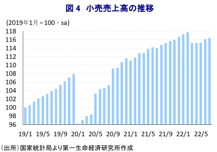 他方、上述のようにサービス業の企業マインドは堅調な動きが続くなど家計消費の追い風になることが期待されたものの、7月の小売売上高(名目ベース)は前年同月比+2.7%と前月(同+3.1%)から伸びが鈍化しており、底入れが期待された流れに早くも一服感が出ている。前月比も+0.27%と前月(同+0.75%)に続いて4ヶ月連続で拡大しているものの、水準は上海市などでの都市封鎖を受けて大きく下振れする直前の今年2月時点を下回るなど、依然としてその影響を克服出来ていないと捉えられる。さらに、上述のように政府が補助金や減税など消費喚起策に動いていることを反映して自動車(前年比+9.7%)は引き続き堅調な推移が続いており、自動車を除いたベースでは同+1.9%と前月(同+1.8%)からわずかに伸びは加速しているものの、力強さに乏しい状況が続いている。なお、足下の同国においてはウクライナ情勢の悪化を受けた幅広い国際商品市況の上振れを受けてインフレ圧力が強まる動きがみられるなか(注4)、物価の影響を除いた実質ベースでは前年同月比▲0.8%と5ヶ月連続で前年を下回る伸びと試算される上、前月(同▲0.6%)からマイナス幅も拡大するなど下振れしている。さらに、足下においては食料品やエネルギーなど生活必需品を中心にインフレ圧力が強まっていることを勘案すれば、実質ベースでは前月比でも弱含んでいると捉えられる。行動制限の緩和を受けて富裕層を中心とするペントアップ・ディマンドが発現していることを反映して宝飾品(前年比+22.1%)は大きく上振れしているほか、食料品(同+6.2%)や燃料(同+14.2%)など生活必需品に対する需要も堅調な動きがみられる。その一方、不動産需要の低迷が続いている上、足下では成約済であるにも拘らず未完成状態が続くマンションを巡って購入者がローンの支払いを拒否する抗議の動きが広がっていることも重なり、建材(前年比▲7.8%)や家具(同▲6.3%)など耐久消費財に対する需要は弱含んでおり、家計消費の足を引っ張っている。また、コロナ禍による行動制限の長期化などを受けて同国においてもEC(電子商取引)を通じた小売が活発化してきた。当月は年初来前年比+5.7%、小売売上全体の25.6%を占めるなど底堅い動きが続いているものの、その動きに一服感が出ている。これは6月に大手ECサイトが創業日に関連した大規模セールを実施しており、それに伴い需要が先食いされた反動が出ているとみられ、ECと親和性が高い化粧品(前年比+0.7%)や日用品(同+0.7%)などの消費が鈍化していることに現れている。足下の企業マインドは堅調な動きをみせているものの、雇用は若年層を中心に厳しい状況が続いており、生活必需品を中心とする物価上昇に伴い実質購買力に下押し圧力が掛かりやすい展開となっていることも家計消費の足かせになっているとみられる。