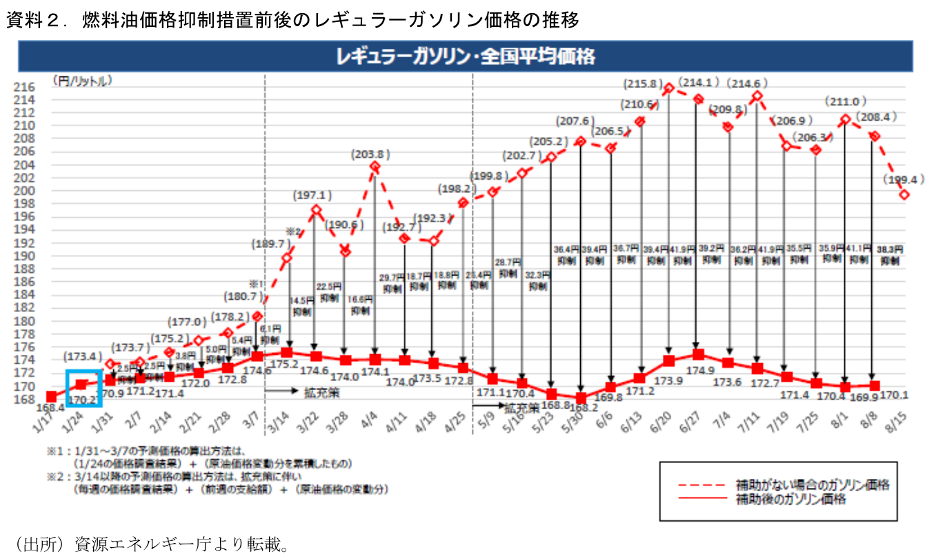 第一に9月上旬のとりまとめが予想される物価高対策、年内成立が予想される第2次補正予算の行方である。岸田首相は8/10の組閣後の記者会見において、「先般の補正予算で5.5兆円の予備費を確保いたしました。まずはこれを機動的に活用していくことをしっかり考えてまいります。そしてその上で、その後については、物価、景気両面の状況に応じて迅速かつ総合的な対策に切れ目なく取り組んでまいりたいと思います。よって、この予備費を機動的に活用した上で、状況をしっかり見極めた上で、その後の対策については判断をしていきたいと考えております。」と述べた。また政府は8月15日に物価・賃金・生活総合対策本部を開催。岸田首相は①食料品の価格上昇対策、②エネルギー対策、③1兆円の地方創生臨時交付金の増額の3点を指示、9月上旬をめどに対策を取りまとめることとした。資料1に指示の内容をまとめたが、とくにI.燃料油価格対策の延長、II.地方創生臨時交付金増額、について大きめの歳出増が伴う形になりそうだ。Iについては、原油価格は足元落ち着きを見せているが、依然としてガソリンなどの価格は対策の基準額を上回っており、何らかの形で延長が図られる公算が大きい。足元の予備費5.5兆円を活用したうえでこれらの対策が実施されることになるが、一定のバッファーを持たせて2兆~3兆円台程度の対策になると予想される。