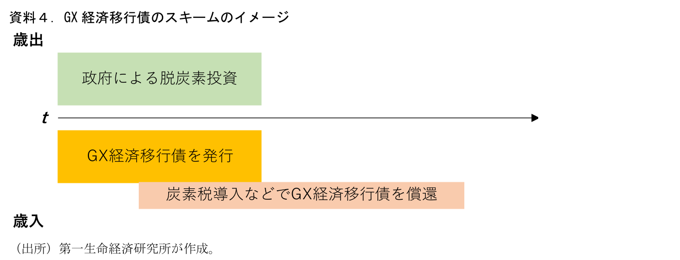 第二に、防衛・脱炭素・子育て予算の議論である。骨太方針などにおいて中長期的な増額が議論されている3項目だが、それぞれ議論のステータスは異なる(資料3)。既に多くのことが決定しているのが脱炭素で、脱炭素に関する政府投資は10年で20兆円、新しい国債であるGX経済移行債を用いて行う旨が表明されている。決まっていないのは償還財源をどうするか。骨太方針2022では「将来の財源の裏付けをもったGX経済移行債」と記されており、何らかの形で償還財源を確保するスキームとなる。また“将来の財源”と記されていることはいったん歳出先行となることの示唆でもあろう。いったん歳出先行としたのち、将来の炭素税増税などを充てる形になると見込まれる(資料4)。