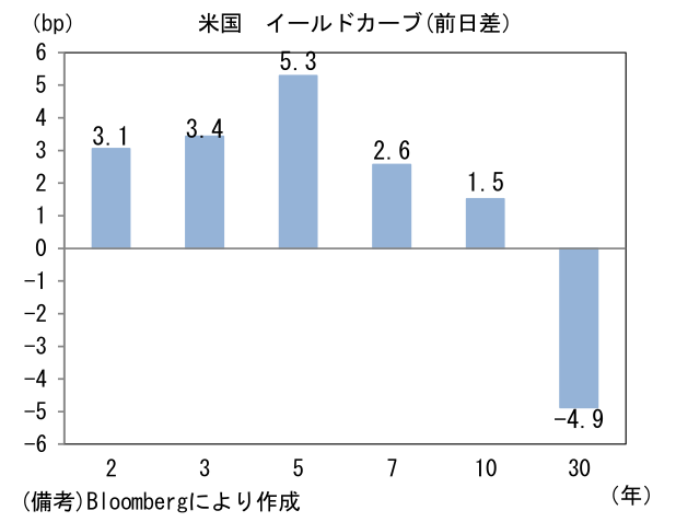 - 米金利カーブはツイスト・フラット化。債券市場の予想インフレ率(10年BEI)は2.582%(▲2.9bp)へと低下。実質金利は0.455%(+4.3bp)へと上昇。