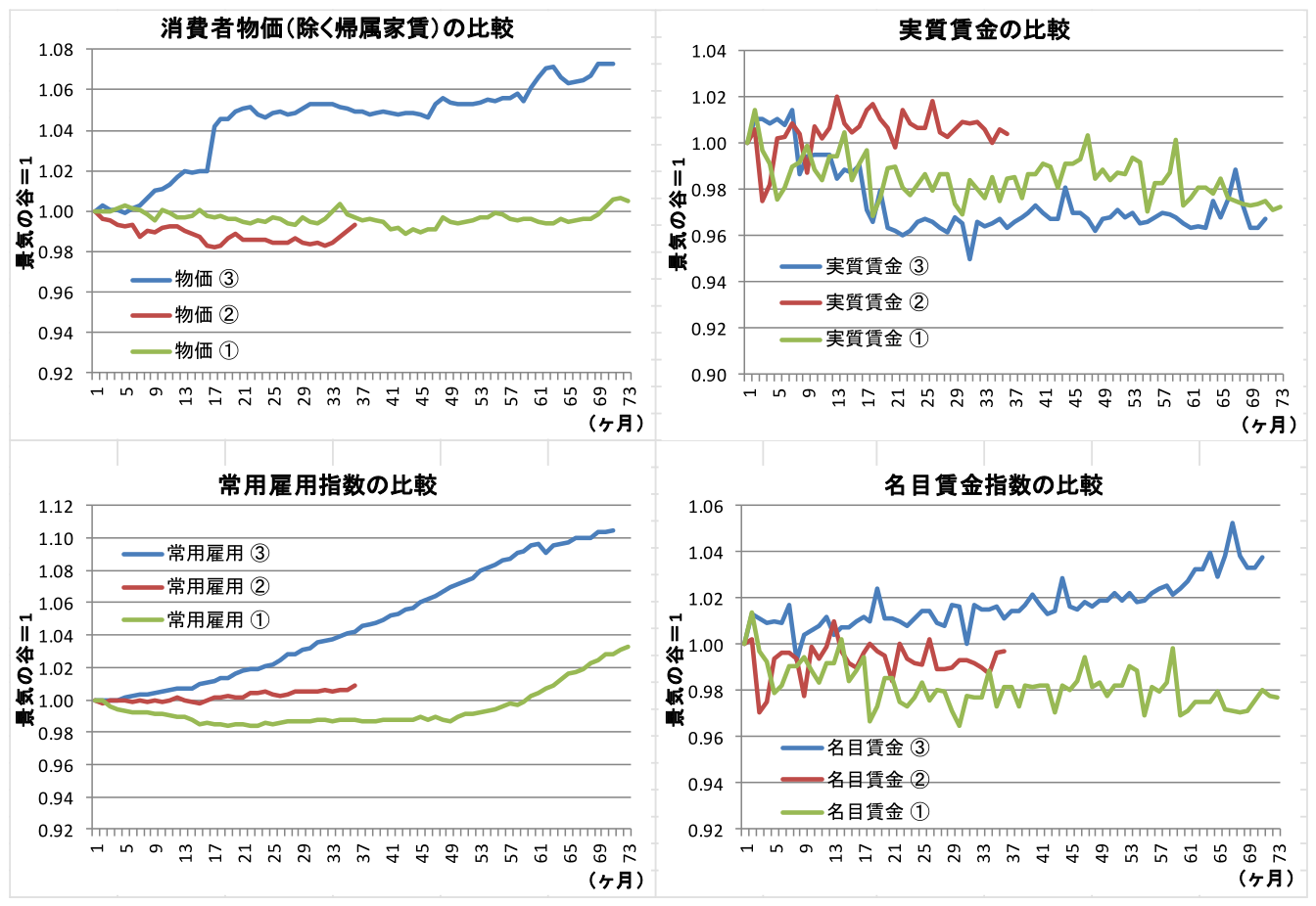 ③の特徴としては、極端な円高・株安の是正と世界経済の拡大により需要が拡大して労働需給が逼迫し、それに従って雇用が大きく増えた。そして、名目賃金が増加したことや物価が上昇したことがそれまでと異なる点である。常用雇用者数で見れば、③の局面では過去二回の回復局面をかなり上回る形で増加している。名目賃金が大幅に増加しているのも頷ける。しかし、実質賃金が大きく水準を下げている。
