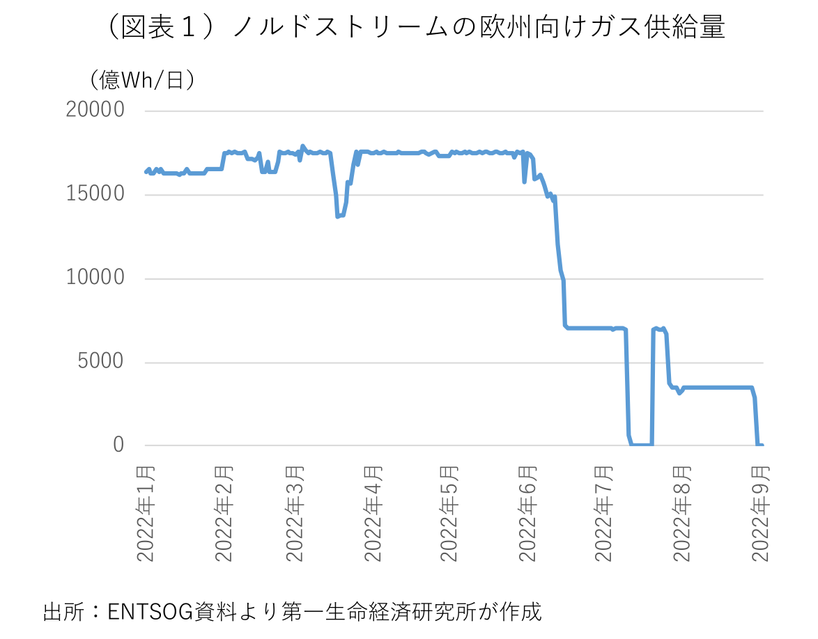ロシアは6月中旬に欧米の経済制裁で修理したタービンの納入ができなくなったことを理由に、ノルドストリームのガス供給量を通常の約4割に縮小し、7月中旬の定期点検終了後に点検開始前の供給量に戻したが、直ぐに別のタービンの不具合を理由に通常の約2割に供給量を絞り込み、今回の点検終了後は供給を完全に停止した(図表1)。これにより、ロシアと欧州を結ぶ4本のガスパイプラインのうち2本が完全に停止し、残り2本も、トルコ経由が通常通りの供給が継続されている一方、ウクライナ経由が通常時よりも大幅に削減されている。