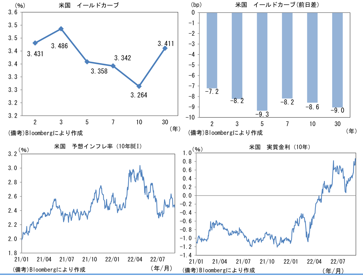 - 米金利カーブはブル・フラット化。債券市場の予想インフレ率(10年BEI)は2.450%(▲3.0bp)へと低下。実質金利は0.810%(▲5.5bp)へと低下。