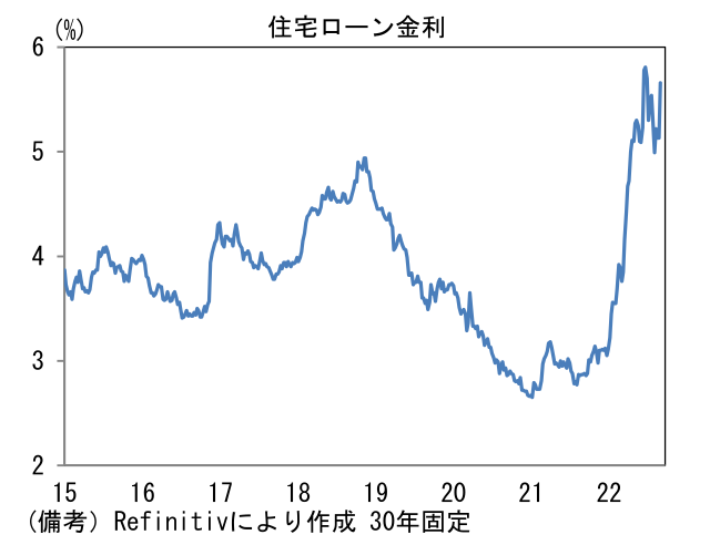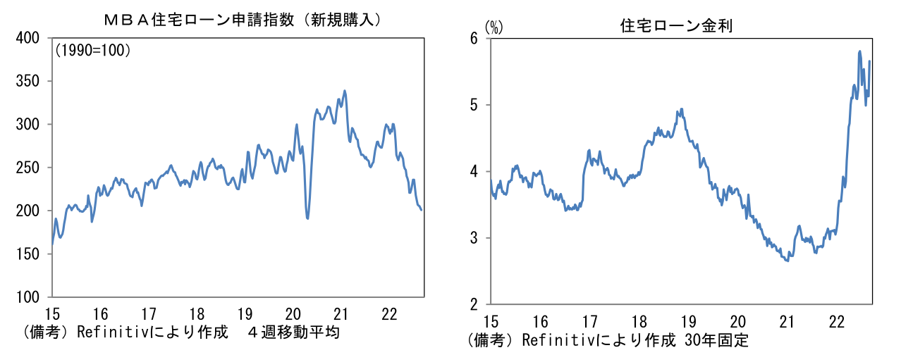- MBA住宅ローン申請指数(新規購入)は前週比▲0.7%と5週連続の減少。直近10週のうち9週で減少となっており、年初来の下向き基調に歯止めがかかっていない。30年固定住宅ローン金利が再び6%近傍へ上昇していることに鑑みると、当面の住宅市場は減速が予想される。