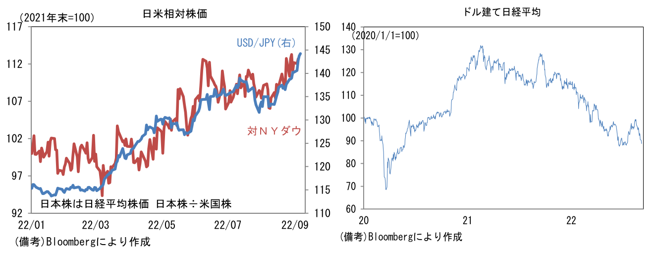 - (海外)投資家が日本株の本源的価値に魅力を感じ長期資金を投入しているかは別として、直近の円安が日本株にプラス影響を与えているのはグラフをみれば明らかだろう。円安が加速度的に進行した3月以降、日本株は米国株を明確にアウトパフォームし、且つその勢いはここ数日の円安で一段と強まっている。この間のドル建て日経平均の下落に鑑みると、円安が本邦製造業の競争力を本質的に向上させるとの期待が膨らんでいる印象は受けないが、それでも円建て日経平均の底堅さに寄与しているのは事実。改めて言及するまでもなく円安は海外子会社の収益、輸出金額を膨らませEPSを押し上げる。日経平均の採用銘柄数、TOPIXの時価総額は共に約6割が製造業であるから円安の恩恵が株価指数(上場企業)に及び易いという特性がある。そうした背景もあってTOPIXの予想EPSは増加基調を維持し、下向きのカーブを描くS&P500とは対照的な姿となっている。