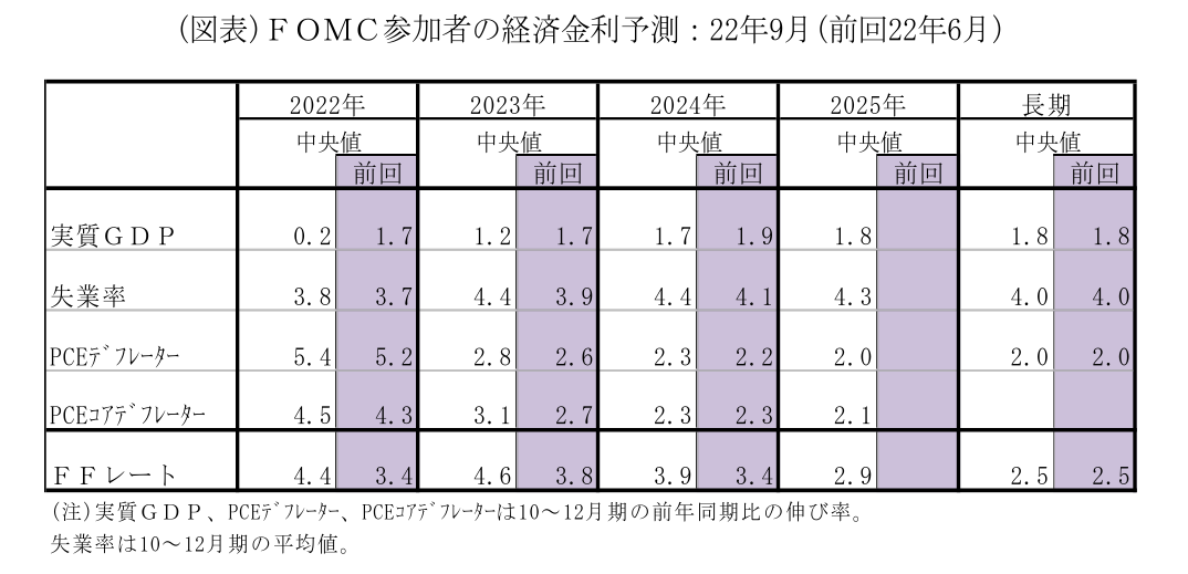 22年9月のFOMCで、FRBは市場コンセンサス通り75bpの大幅利上げを決定した。インフレ高進、労働市場の逼迫の持続を受け、6、7月に続いて異例の大幅な利上げとなった。今回の大幅利上げでFFレート誘導目標レンジは3.00~3.25%となったが、パウエル議長は金融引締め水準に入ったばかりであり、労働市場の逼迫やインフレ高進を背景に、FRBは金融引締めを強化していく必要があるとの見方を示した。また、ドットチャート(ドットプロット)ではFFレート誘導目標の適切な水準の予想中央値が22年末4.4%と引き上げられたうえ、23年も利上げを継続することによってターミナルレートは4.6%と大幅に上方シフトした。