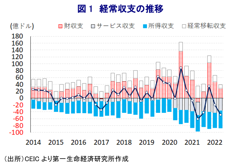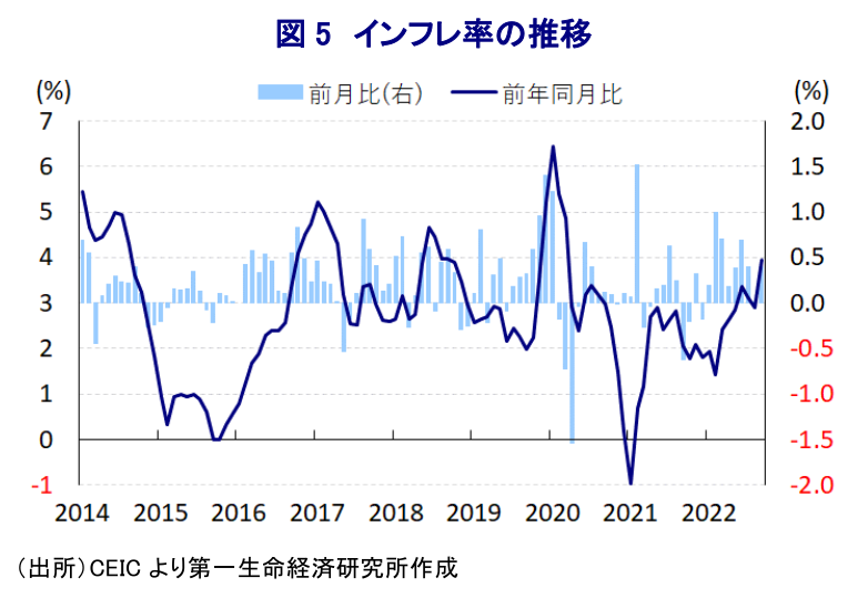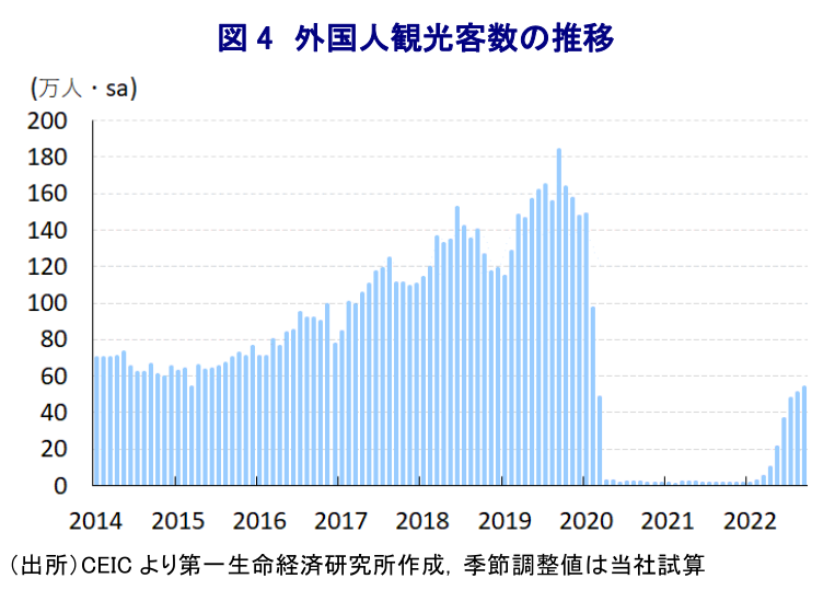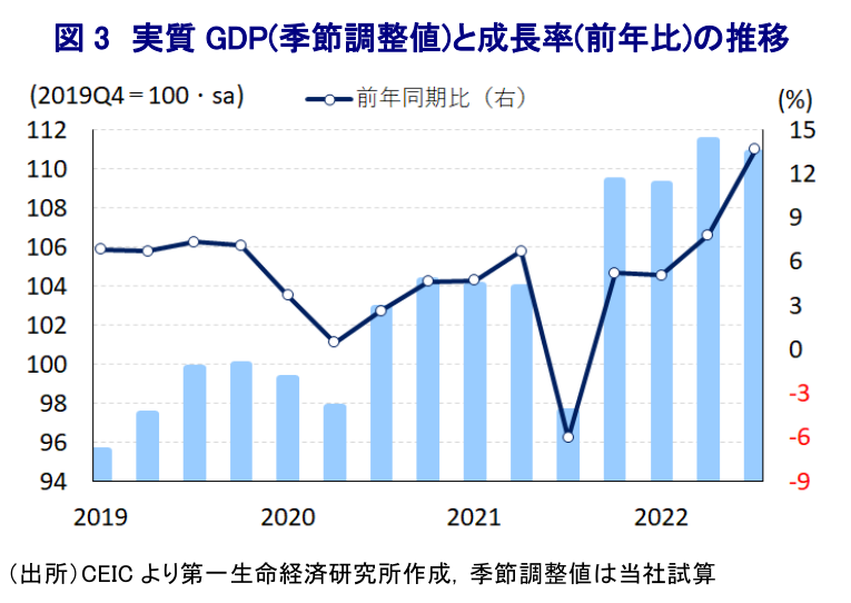 - 先行きも外国人観光客の拡大は期待される一方、世界経済の減速懸念は財輸出の足かせとなる、物価高と金融引き締めの動きは内需の重石となることが懸念される。今年通年の経済成長率は政府目標(7%)を上回ると見込まれるが、内外需で景気の足かせとなる要因は山積するなど、足踏み状態が続く可能性は高い。
