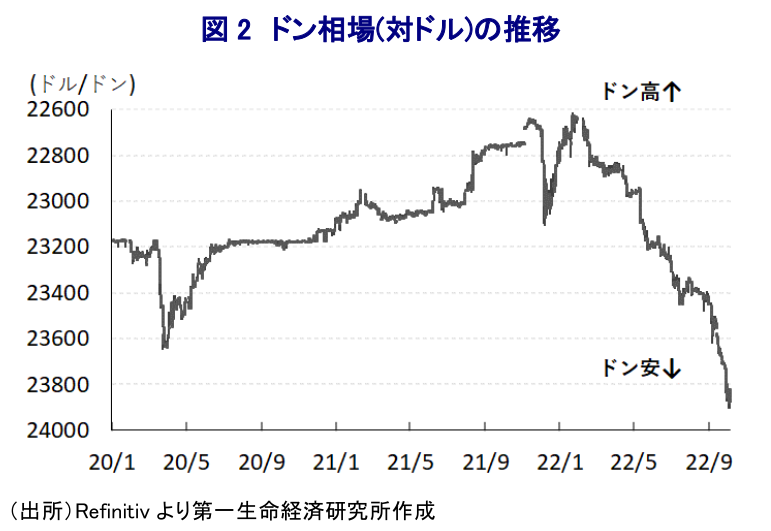 足下の世界経済を巡っては、中国による『ゼロ・コロナ』戦略への拘泥が中国のみならず、サプライチェーンの混乱を通じて様々な国に悪影響が伝播する動きがみられるほか、商品高による世界的なインフレを受けて米FRB(連邦準備制度理事会)など主要国中銀はタカ派傾斜を強めていることを受け、欧米など主要国の景気も頭打ちの様相を強めるなど、全体的に景気減速が警戒される状況にある。なかでも米FRBなど主要国中銀のタカ派傾斜は世界的なマネーフローに影響を与えており、国際金融市場においては経済のファンダメンタルズ(基礎的条件)の脆弱な新興国を中心に資金流出の動きが強まる動きがみられる。さらに、こうした動きを反映して米ドル高が進行していることを反映して多くの新興国通貨に調整圧力が強まり、商品市況の上振れによるインフレ圧力が強まるなかで通貨安は輸入物価を通じて一段のインフレ昂進に繋がることが懸念される。ベトナムは商品市況の上振れによる輸入拡大が財貿易収支の黒字幅を縮小させるとともに、コロナ禍を受けた外国人観光客数の激減の動きはサービス収支の赤字拡大に繋がるとともに、資金流出の動きを反映して所得収支の赤字幅も拡大しており、足下の経常収支は赤字基調を強めるなど対外収支は悪化している。さらに、一昨年来のコロナ禍対応を目的とする財政出動を受けて財政状況も急速に悪化している。ベトナム金融市場を巡っては、周辺のASEAN(東南アジア諸国連合)諸国と比較して国際金融市場への開放度合いは低いことから、国際金融市場を取り巻く環境による直接的な影響を受けにくいとされるものの、このところの世界的なマネーフローの急激な変化やそれに伴う米ドル高を反映して通貨ドンの対米ドル相場は調整の動きを強めており、足下では最安値を更新するなど輸入物価を通じたインフレ昂進に繋がることが懸念される。なお、直近9月のインフレ率は前年同月比+3.94%と中銀の定めるインフレ目標(4%以下)をクリアする水準に留まるなど、他のASEAN諸国では軒並みインフレ率が目標を上回る水準に加速していることを勘案すれば相対的に落ち着いていると捉えられる。しかし、緩やかながら年明け以降のインフレ率は加速の度合いを強めている上、足下では通貨ドン相場が調整の動きを強めるなど物価を取り巻く状況が急速に厳しさを増していることを受けて中銀は先月22日に翌23日付で政策金利を100bp引き上げる決定を行うなど(リファイナンス金利:4.00→5.00%、公定歩合:2.50→3.50%)、それまで景気下支えを優先する考えを示してきた流れからの転換を迫られている。他方、景気の不透明要因となってきたコロナ禍を巡っては、ワクチン接種の進展や国民の平均年齢の低さも追い風に同国政府はこれを事実上エンデミック(一定の季節や地域に流行する感染症)と見做すべく対応を変更させるなど、『ポスト・コロナ』に向けた動きが大きく前進している。よって、コロナ禍が経済活動の制約要因となる可能性は大きく後退していると捉えられる。