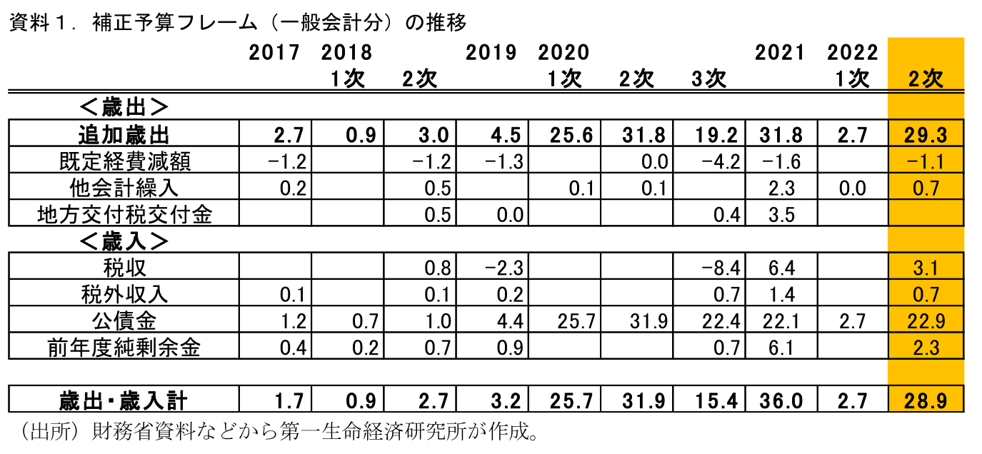 政府は8日に2022年度第2次補正予算を閣議決定した。先般決定した物価高対策を中心とする総合経済対策の裏付け予算になる。追加歳出規模は29.3兆円(経済対策関連29.1兆円+その他0.2兆円)と2021年度の補正予算に匹敵する大規模な予算となっている。