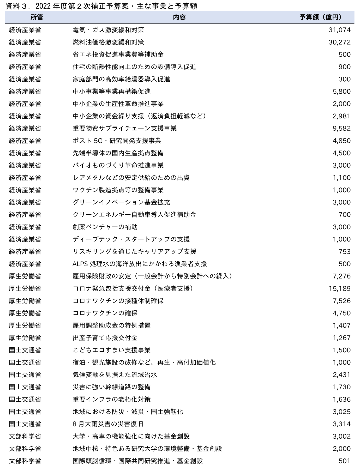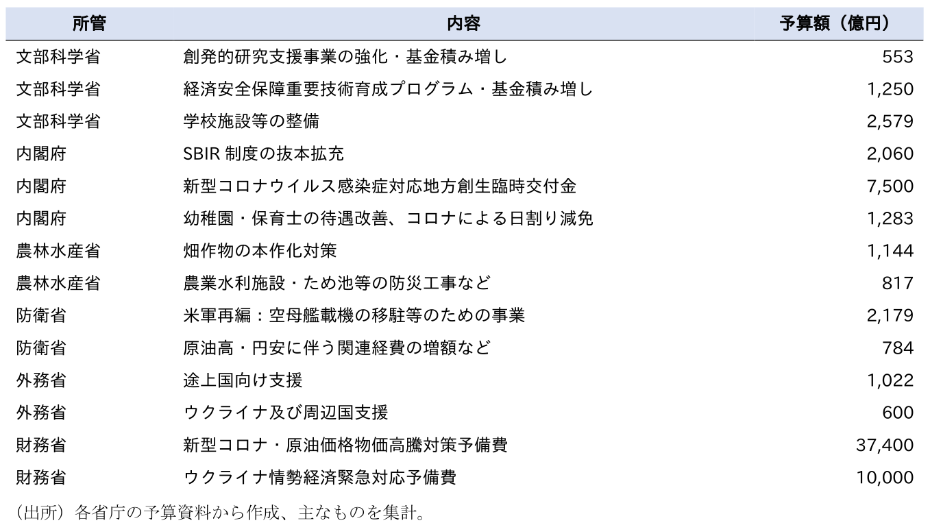 短期のGDP押し上げ効果が小さいとみられるものとして、基金がある。基金は中長期の支出を前提にしており、GDPへの即効性は低いと考えられるためである。今回は菅政権時に創設したグリーンイノベーション基金の増額のほか、文部科学省が大学整備等の基金積み増しなどに予算を計上している。厚生労働省のコロナ対策は3.6兆円と大きな額が計上されているが、医療機関への支援金やワクチン購入費用などが中心。輸入品であるワクチンの購入はGDPの押し上げには貢献しない(政府消費は増えるが輸入増で相殺)など、需要喚起効果は限定的とみられる。また、地方創生臨時交付金や雇用保険特別会計への繰入といった政府間移転も含まれる。前者は使途が地方自治体に委ねられるため効果の計測が困難、後者は実体経済への影響はない。また、今回既存のコロナ・原油高物価高騰予備費の積み増し、ウクライナ対応予備費の新設で予備費が新たに4.7兆円追加されている。使用することが決定していないため、経済対策効果としては算入すべきではないだろう。その他、中小企業支援や賃上げ・投資・研究開発支援などを軸に内容は多岐にわたっている。