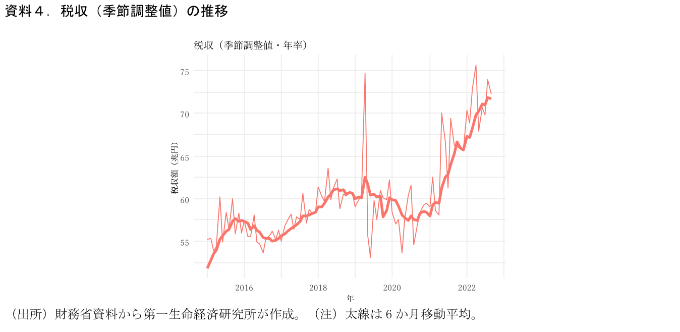 しかし、今回の税収上方修正は、今年7月に公表された21年度税収が大きく上振れしたことに合わせて、22年度の水準を調整した、という側面が大きい。財務省が月ごとに公表している税収額に季節調整を施したものが資料4だ。年換算値でみると直近の水準はすでに70兆円を超えている。円安などによる企業業績の改善、コロナ禍一服による消費の回復などが寄与しているものとみられる。実際の22年度税収はここからさらに上振れする可能性が高いと考えられる。