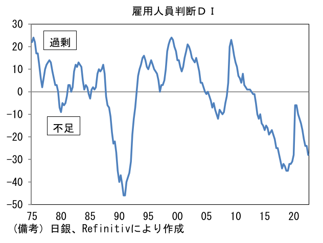 先行きの賃金を読む上では企業業績がもちろん重要であるが、価格設定スタンスの変化と構造的な労働力不足を加味する必要がある。1995年からの失業率と所定内給与の関係、いわゆる賃金版フィリップスカーブに目を向けると現在の2%台半ばの失業率に整合的な賃金上昇率は+1.3%程度であり、直近データはちょうど傾向線上に位置しているが、「40年ぶりのインフレ」という特殊な状況に鑑みると、賃金が従来のトレンドから非線形に上昇する可能性がある。従来の関係に基づけば、賃金が3%台に乗せるには失業率が1%台に向けて更に低下する必要がありやや非現実的に思えるが、構造的な労働力不足と価格設定スタンスの変化の相乗効果によって失業率が劇的に低下しなくとも賃金が上昇する可能性はある。