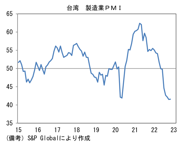 - 直近発表されたアジアの製造業データは総じて弱含んでおり、世界経済の減速を映じている。昨日発表された11月の中国貿易統計(USDベース)は輸出が前年比▲8.7%、輸入が▲10.6%となりそれぞれ明確な落ち込んだ(貿易総額は▲9.7%)。ゼロコロナ戦略による稼働率低下の影響もあったと推察されるが、対米輸出が▲25.4%(輸入は▲7.3%)と大幅に減速したこと等から判断すると、やはり輸出先の需要減による影響が大きかったとみられる。次に世界経済の先行指標として知られている台湾の指標に目を向けると、7日に発表された11月財輸出(USDベース)は前年比▲13.1%となり2015-16年の中国経済減速局面と同程度のマイナスとなった。ICT(情報通信技術)製品や電子製品の落ち込みを背景に、製造業受注が10月時点で前年比▲6.3%へと落ち込んでいたため、輸出の落ち込みそれ自体にさほど驚きはないが、改めて世界経済の減速を印象付ける結果であった。コロナ禍の2020-21年にノートPC、スマホやゲーム関連などで発生した特需が剥落するなか、高インフレによる混乱も加わりIT関連財の需要は低下基調にある。