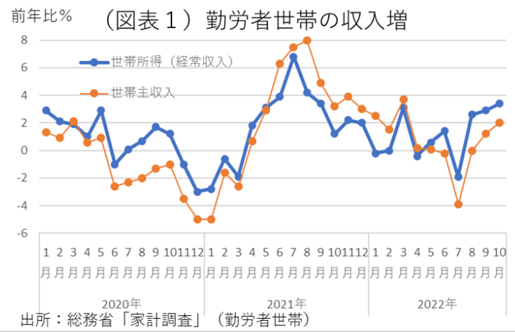 それは事実なのだが、世帯収入でみると、収入は意外に増えている。総務省「家計調査」(2人以上の勤労者世帯)では、経常収入が2022年10月の前年比3.4%まで伸びている。8月の前年比2.6%、9月の同2.9%だから、数か月間に亘ってかなり堅調だと言ってよい。