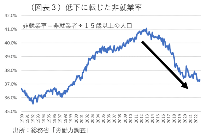 高齢化が進む中で、日本人の就労構造は変わりつつある。公的年金だけでは食べていけないから65歳以降も働き続ける人が増えた。さらに、60~64歳までの就労率も上がっている。象徴的なデータは、15歳以上人口に占める非就業率が2013年頃から低下に転じていることだ(図表3)。この2013年と言えば、公的年金の報酬比例部分の支給開始年齢が、男性で60歳から61歳へと遅らされた年である。今まで非就業率が低かった60~64歳の人も、継続雇用で働かざるを得なくなった。