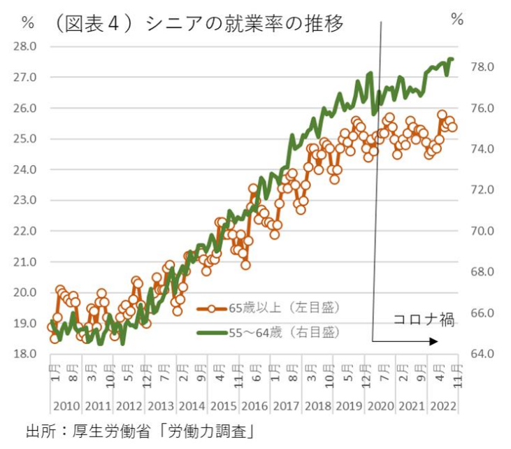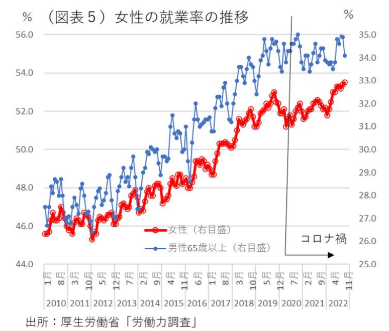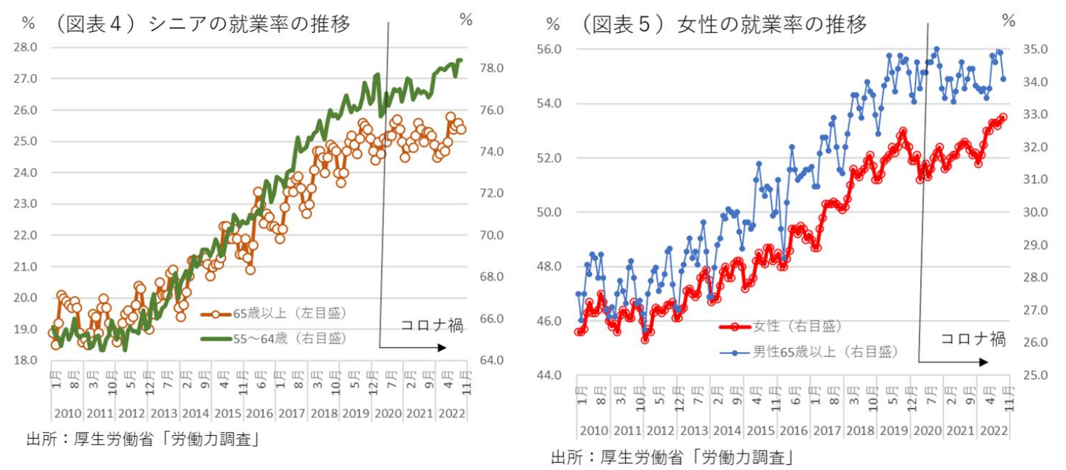 この変化は、女性の就業率の上昇やシニアの就業率の上昇と裏腹の関係になっている(図表4、5)。コロナ禍では、当初は職探しが困難で、就業機会も限られていた。それが、ウィズ・コロナが定着してきて、2022年春頃から就業できる人が増えてきたと考えられる。それが2022年に入ってからの女性・シニアの就業率の上昇につながっている。